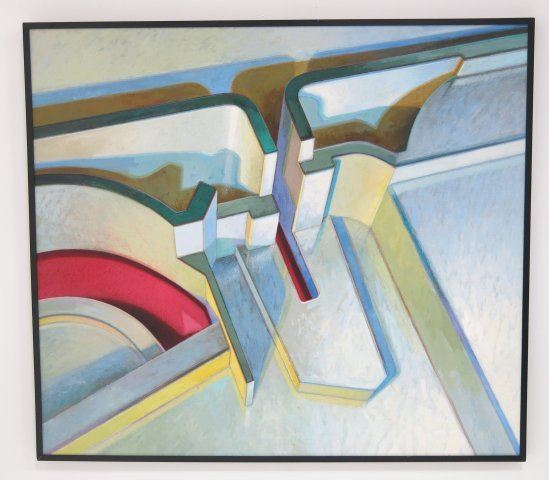 Acrylic on canvas. Framed. Label on rear. William Roth Kohn, American (1931-2004). Approx. 51" x 59" without frame, 52" x 60" with frame. Good condition.