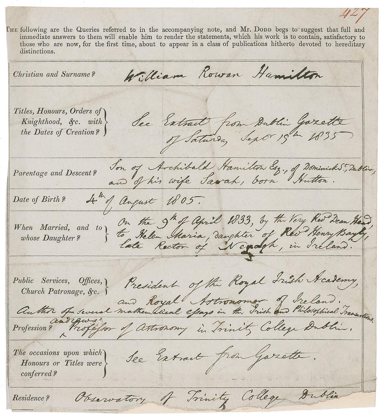 Born in Dublin, Hamilton become one of the greatest mathematicians of all time, regarded even early in his career as a successor to Isaac Newton. Knighted in 1835 for his scientific contributions, he was chosen for recognition in the prestigious 1841 publication Dodd’s Knightage. Here, he carefully details personal information, including identifying his wife, Helen Maria. It was while strolling with his wife in 1843 that Hamilton was struck by a formula for Quaternions, a non-commutative extension of complex numbers. Delightful personal insight for a notable publication by one of the greatest scientific minds of the 19th century.