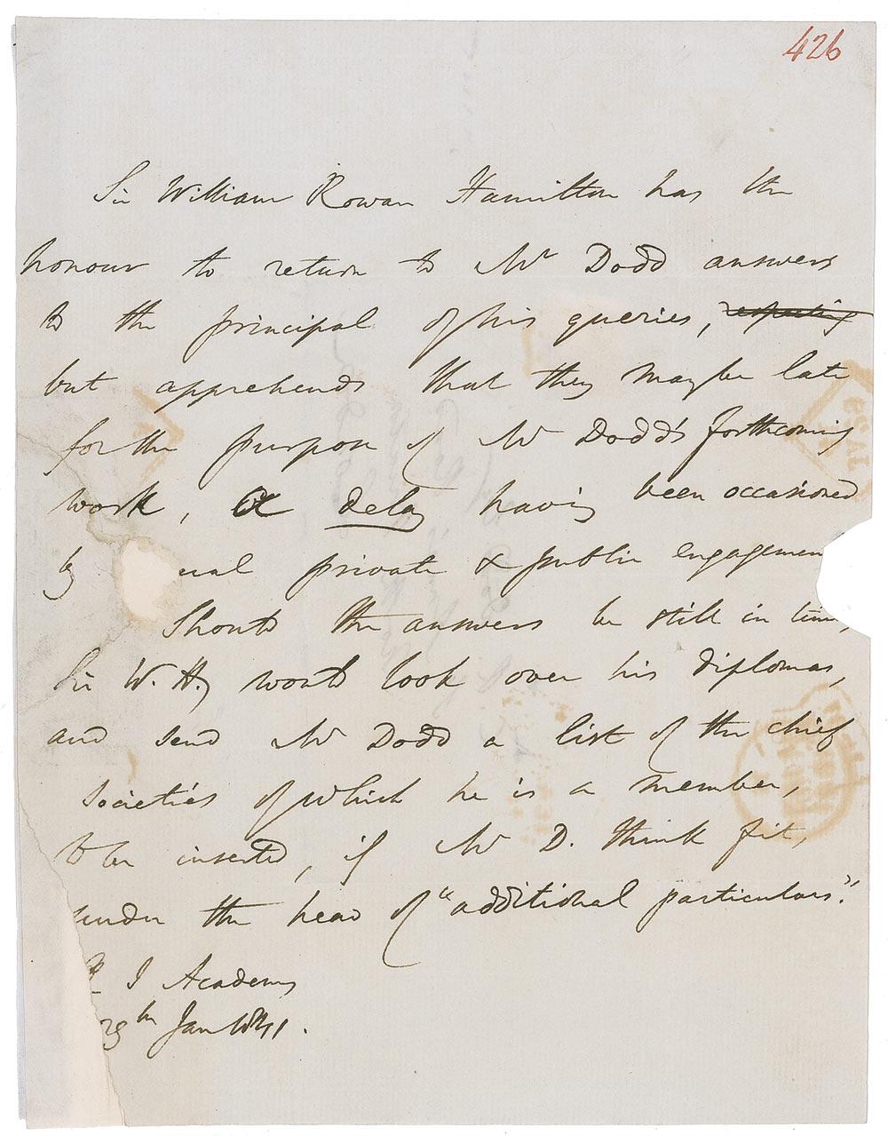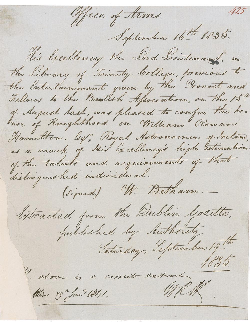 Irish physicist, astronomer, and mathematician (1805-1865), who made important contributions to classical mechanics, optics, and algebra. His greatest contribution is perhaps the reformulation of Newtonian mechanics, now called Hamiltonian mechanics. DS, filled out and signed by Hamilton, one page, 7.25 x 8, no date. Hamilton provides biographical information to Dodd’s Knightage. After writing out his full name, Hamilton answers eight questions including: “Profession: Andrews Professor of Astronomy in Trinity College Dublin,” “Residence: Observatory of Trinity College Dublin,” and “When married and to whose daughter: On the 9th of April 1833 by the Very Rev Dean Head to Helen Maria, daughter of Rev. Henry Bayly.” In very good condition, with paper loss along bottom edge, intersecting folds, scattered creases and wrinkles, small strip affixed to reverse bottom edge, and trimmed edges. Accompanied by two related pieces: a third-person ALS, written by Hamilton, forwarding the material to Dodd’s Knightage, and reading, in part: “Sir William Rowan Hamilton has the honour to return to Mr. Dodd answers to the principal of his queries, but apprehends that they may be late for the purpose of Mr. Dodd’s forthcoming work … Should the answers be still in time Sir W. H. would look over his diploma and send Mr. Dodd a list of the chief societies of which he is a member.”; and a manuscript document in which the bestowal of knighthood of Hamilton is confirmed, initialed at the conclusion in another hand “WRH.”