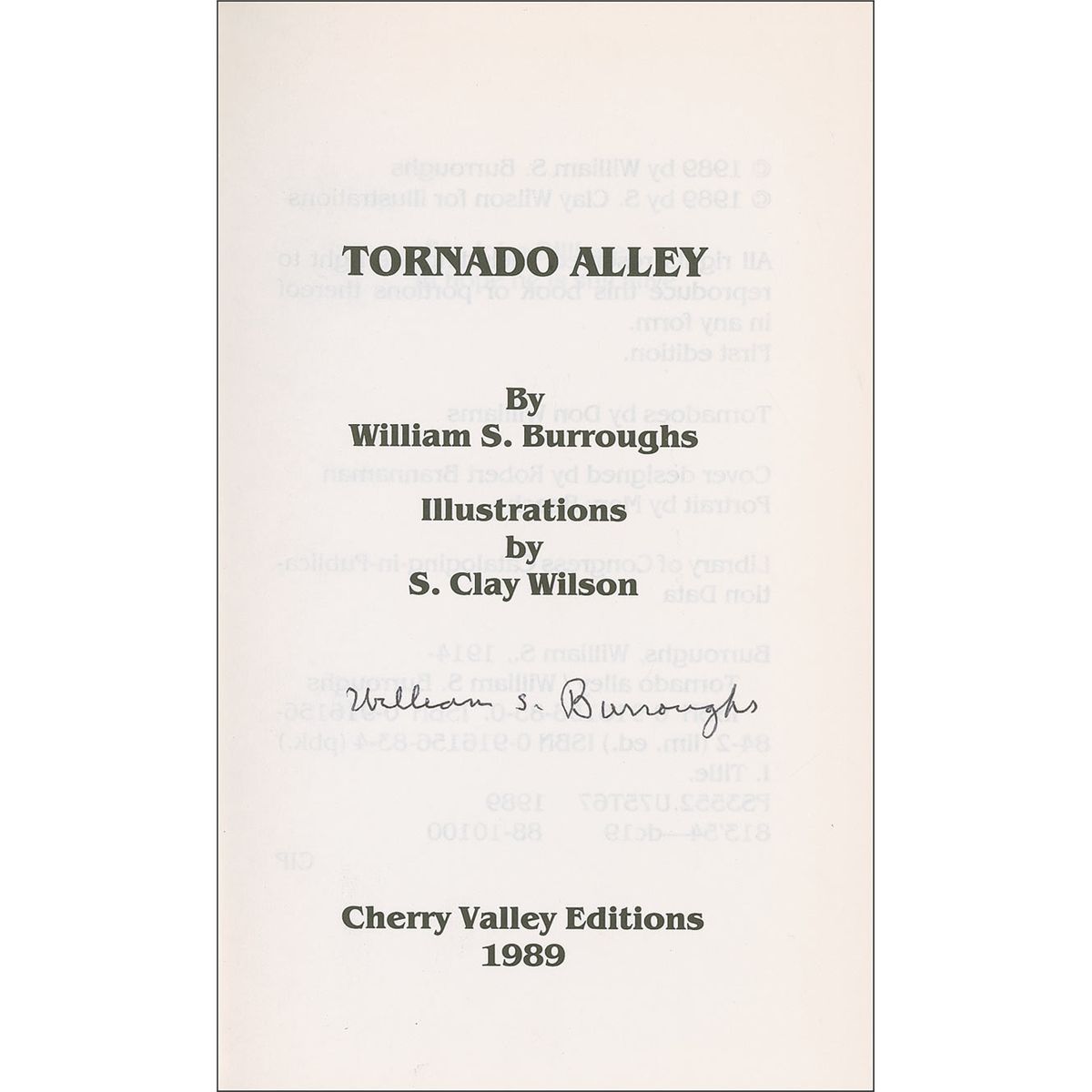 Signed book: Tornado Alley. First edition. Cherry Valley Editions, 1989. Hardcover, 5.75 x 8.75, 53 pages. Signed in black ballpoint on the title page, “William S. Burroughs.” In fine condition, a light pencil notation in another hand on the front pastedown page.