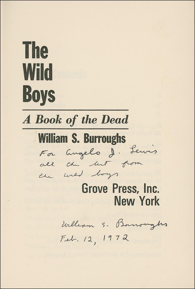 Nearly as well known for his prodigious intake of drugs and sometimes bizarre antics as for his writing, Burroughs drew heavily on his own life for inspiration in producing such novels as Junkie and the legendary Naked Lunch. Signed book: The Wild Boys. Later printing. NY: Grove Press Inc., 1971. Hardcover with dustjacket, 5.75 x 8.25, 184 pages. Signed and inscribed on the title page, “For Angelo J. Lewis, all the best from the wild boys, William S. Burroughs, Feb. 12, 1972.” In fine condition, with scattered creases, tears, and toning to dustjacket. RRAuction COA.