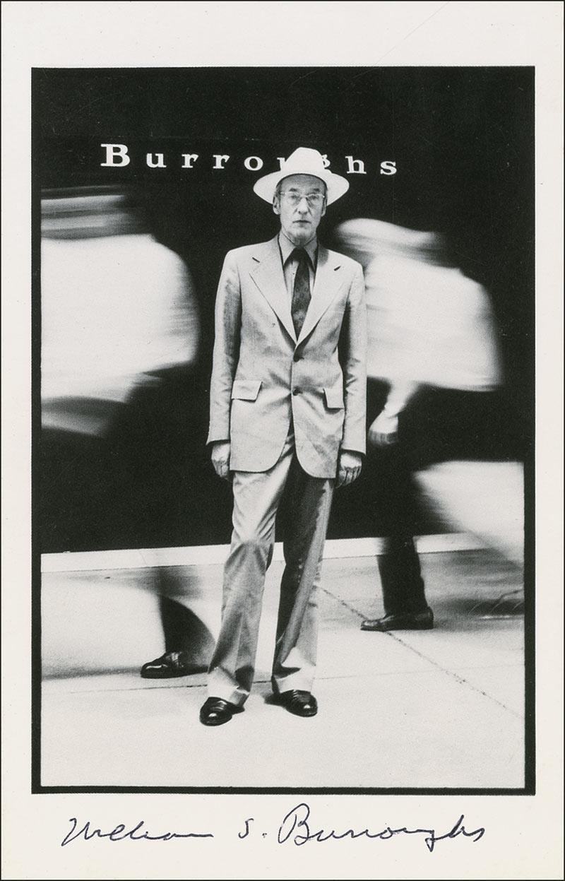 Influential American writer (1914–1997) who takes a place among the seminal figures of the Beat Generation. Nice 5 x 5.5 postcard photo of Burroughs on a New York sidewalk, signed in the lower border in black ballpoint. In fine condition. RRAuction COA.