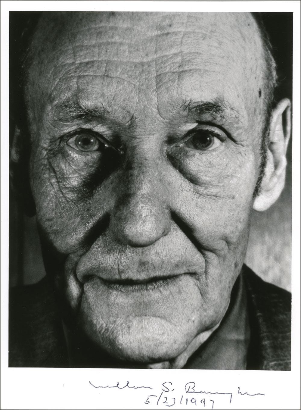 Influential American writer (1914–1997) who takes a place among the seminal figures of the Beat Generation. Striking satin-finish 7 x 9.5 close-up photo, signed in the lower border in black ballpoint, “William S. Burroughs, 5/23/1997.” In fine condition.