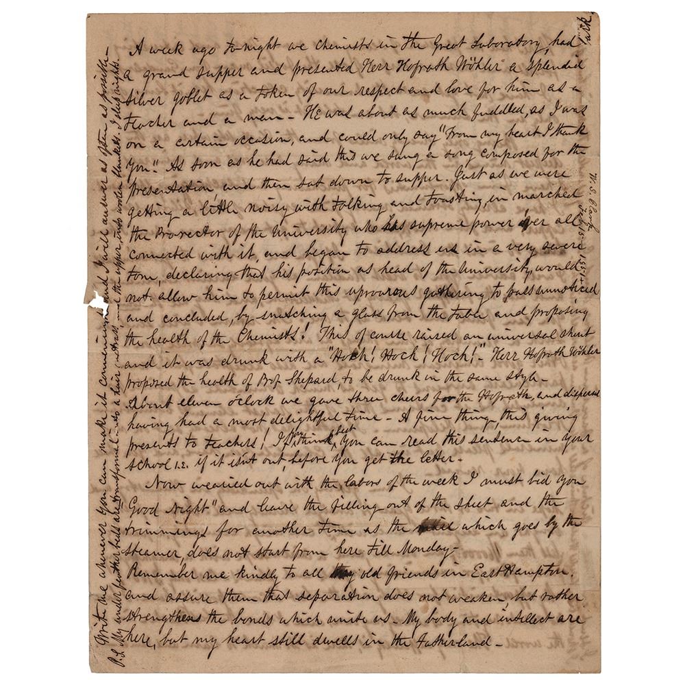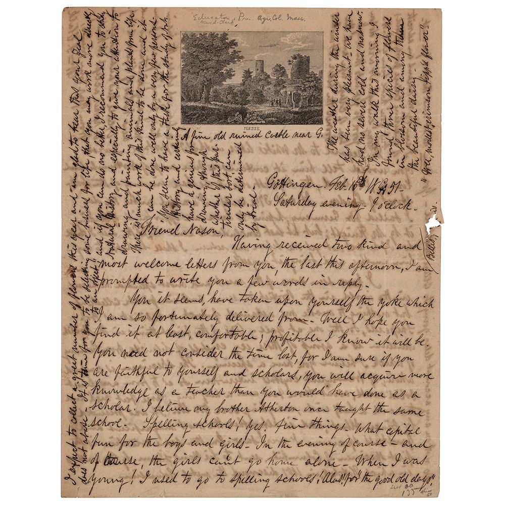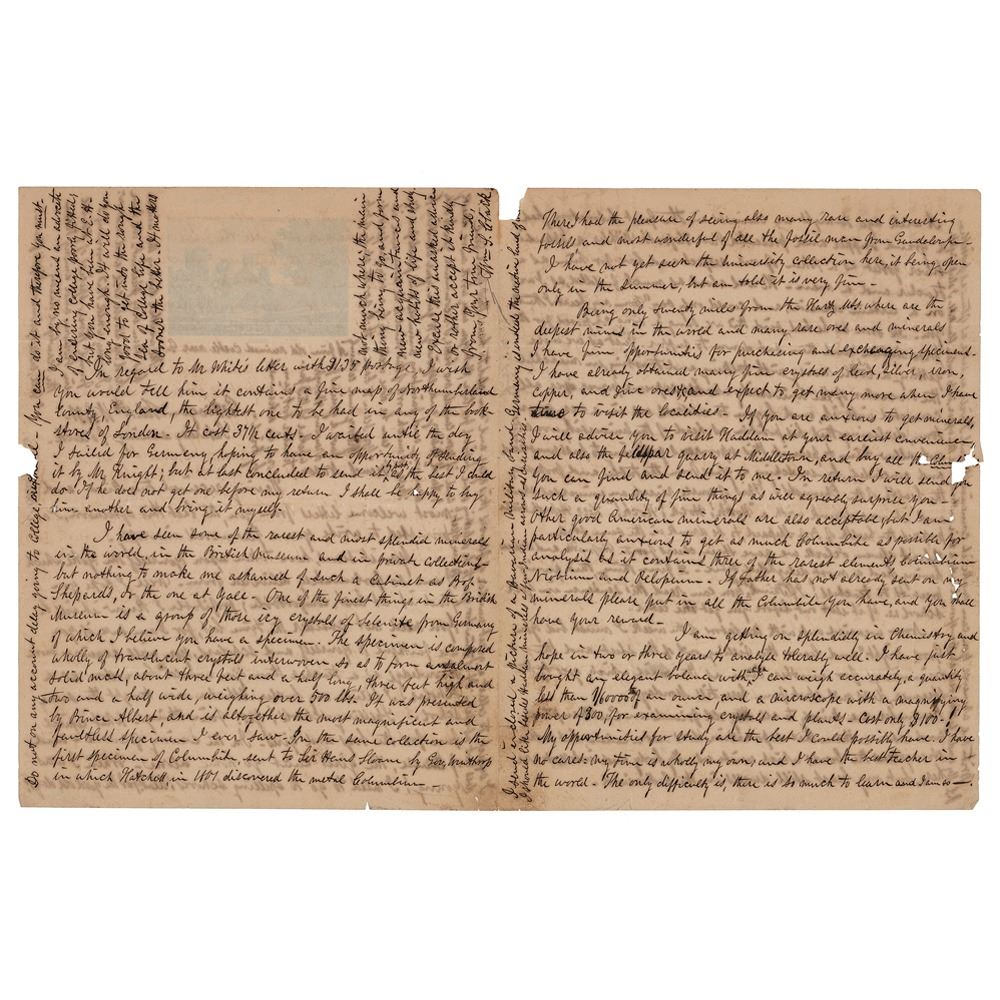 American professor of chemistry, botany, and zoology, colonel during the American Civil War, and leader in agricultural education (1826-1886) remembered for his employment by the Japanese government to establish the Sapporo Agricultural College; he made a significant impact on the scientific and economic development of the island of Hokkaido, and made a lasting imprint on Japanese culture with his popular phrase: 'Boys, be ambitious!' ALS signed "Wm. S. Clark," four pages on two adjoining sheets, 8.25 x 10.5, February 16, 1851. Handwritten letter from Gottingen, where he was attending Georgia Augusta University to obtain a doctorate in chemistry. In part: "I am sure if you are faithful to yourself and scholars, you will acquire more knowledge as a teacher than you would have done as a scholar…I have seen some of the rarest and most splendid minerals in the world, in the British Museum and in private collections-but nothing to make me ashamed of such a cabinet as Prof. Shepard's, or the one at Yale. One of the finest things in the British Museum is a group of those icy crystals of Selenite from Germany of which I believe you have a specimen. The specimen is composed wholly of translucent crystals interwoven so as to form an almost solid mass, about three feet and a half long, three feet high and two and a half wide, weighing over 500 lbs. It was presented by Prince Albert, and is altogether the most magnificent and faultless specimen I ever saw…I had the pleasure of seeing also many rare and interesting fossils, and most wonderful of all the fossil man from Guadeloupe…Being only miles from the Harts Mts. where are the deepest mines in the world and many rare ores and minerals I have fine opportunities for purchasing and exchanging specimens…I am getting on splendidly in chemistry…I have just bought an elegant balance…and a microscope with a magnifying power of 300, for examining crystals and plants. Cost only $100! My opportunities for study are the best I could possibly have." In very good condition, with several thin tears and a few losses to the very fragile paper.