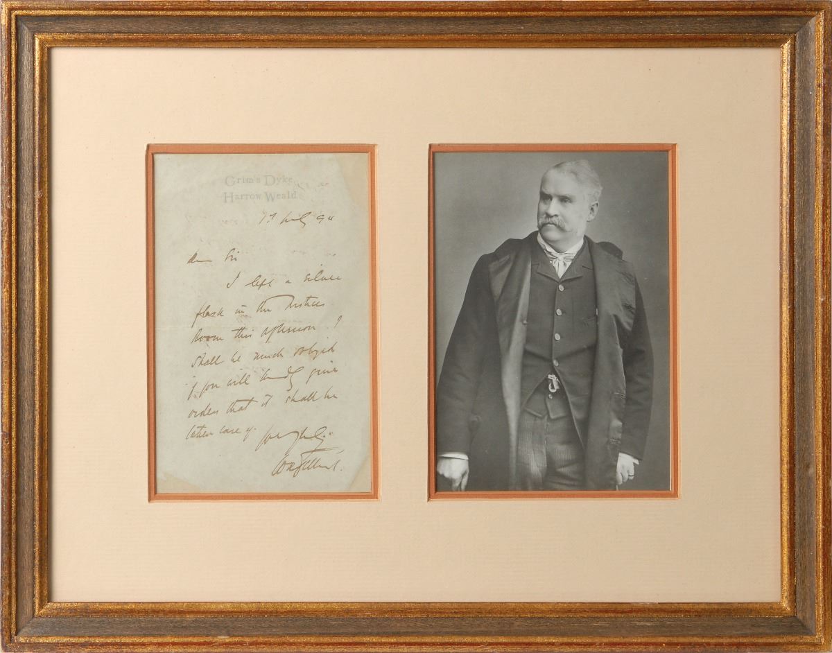 British lyricist (1836–1911) best known for his 14 comic operas written in collaboration with composer Arthur Sullivan. ALS signed “W. S. Gilbert,” one page, 4 x 6.5, Grim’s Dyke, Harrow Weald letterhead, July 17, 1894. In full: “I left a silver flask in the Master’s Room this afternoon. I shall be much obliged if you will kindly give order that it shall be taken care of.” Double-matted and framed with a portrait of Gilbert to an overall size of 15.75 x 12.25. In fine condition, with light toning to three corners.