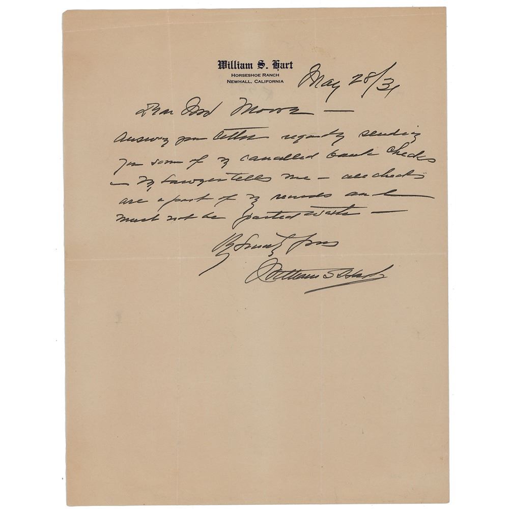 ALS, one page, 8.5 x 11, personal letterhead, May 28, 1931. Handwritten letter to a collector, in full: "Answering your letter regarding sending you some of my canceled bank checks—my lawyer tells me—all checks are a part of my records and must not be parted with." In fine condition, with a crease along the top edge.