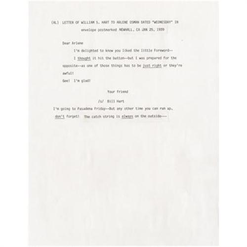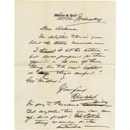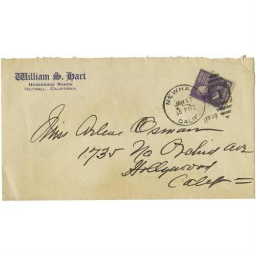 <B>William S. Hart Handwritten Letter.</B></I> A single-page letter on personal stationery, handwritten in black ink by the silent screen actor-director--producer who is best remembered for his realistic Western films. The letter is in Fine to Very Fine condition with mild wear and toning and some mailing creases, and is accompanied by the original mailing envelope, postmarked January 25, 1939, In Fine condition with mild wear and moderate toning. <I>Accompanied by LOA from PSA/DNA.</B></I><BR><BR><b>Shipping:</b> Flat Material, Small (<a target="_blank" href="http://www.heritageauctions.com/common/shipping.php">view shipping information</a>)