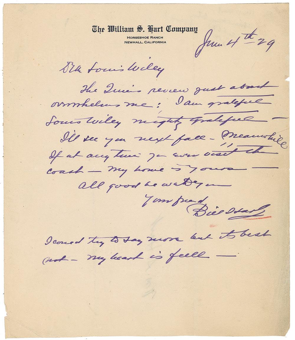 American actor and director (1864–1946) who earned a place in Hollywood history as the screen’s first great movie cowboy. ALS signed “Bill S. Hart,” one page, 8.5 x 10, William S. Hart Company letterhead, June 4, 1929. Letter to Louis Wiley. In part: “The Queen’s review just about overwhelms me: I am grateful…mighty grateful…If at any time you ever visit the coast—my home is yours.” Hart also adds a brief postscript reading, “I could try to say more but its best not—my heart is full.” In fine condition, with intersecting folds, a few small edge dings, and a red pencil underline under signature. Pre-certified PSA/DNA and RRAuction COA.