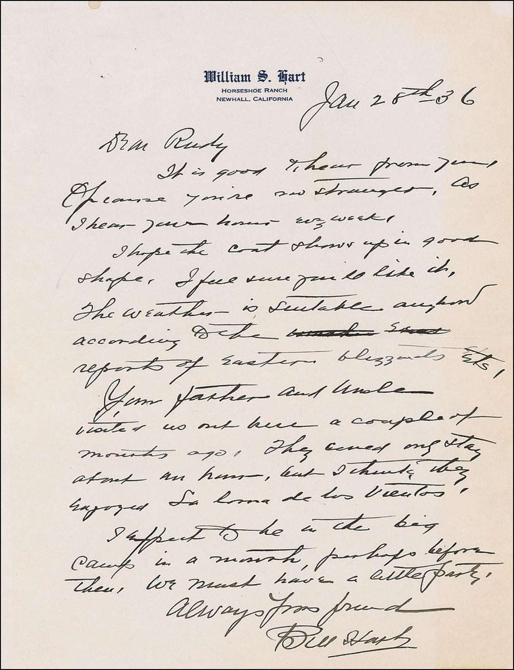 ALS signed “Bill Hart,” one page, 8.5 x 11, personal letterhead, January 28, 1936. Hart writes to his friend Rudy Vallée. In part: “It is good to hear from you. Of course you’re no stranger, as I hear your hour every week. I hope the coat shows up in good shape. I feel sure you’ll like it. The weather is suitable anyhow according to the reports of Eastern blizzards etc…I expect to be in the big camp in a month, perhaps before then, we must have a little party.” In fine condition, with intersecting mailing folds, and some scattered mild edge toning. Pre-certified PSA/DNA and RRAuction COA.