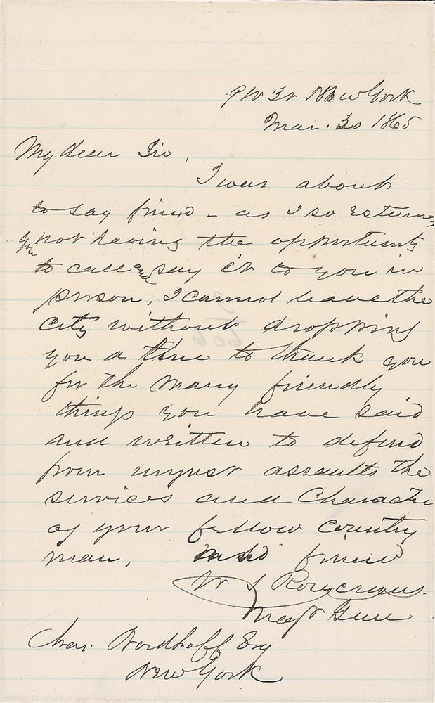 Though ‘Old Rosy’ was a gifted tactician and highly respected general among his men, he lost the support of U. S. Grant midway through the Civil War when he made a fatal mistake at the Battle of Chickamauga. With 16,000 Union soldiers lost and Chattanooga opened up to Confederate attacks under Bragg, Grant relieved Rosecrans from his duties. Widely considered a disappointment and a failure, he was reassigned to Missouri and left awaiting orders that never came; after years of resentment, he eventually resigned his commission in the army in 1867. Grateful for the support of a New York editor, the disgraced general sent this kind note as his ambitions of military greatness were coming to a close. An excellent war-dated letter from a one-time integral part of the Union forces.