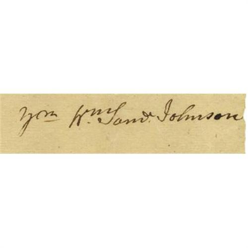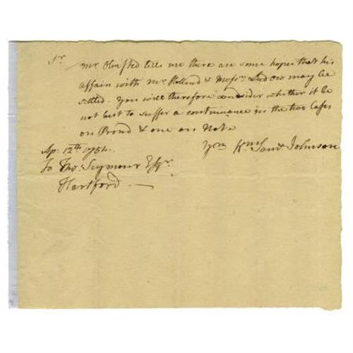 <B>William Samuel Johnson Autograph Letter Signed</B></I> "<I>Wm Saml Johnson,</B></I>" one page, 7.5" x 6". Connecticut , April 12, 1754, to Thomas Seymour, Hartford. In full, "<I>Mr. Olmsted tells me there are some hopes that his affairs with Mr. Holland & Messrs Ludlow may be settled. You will therefore consider whether it be not best to suffer a continuance in the two Cases on Bond & one on Note.</B></I>" William Samuel Johnson, a signer of the Constitution, served as a delegate to the Stamp Act Congress held in New York City in October 1765. From 1785-1787, he represented Connecticut in the Continental Congress and in the U.S. Senate from 1789-1791. A graduate of Yale (1744) and Harvard (1747), Johnson was the first President of Columbia College from 1787-1800.<B> </B></I>Mounting strip affixed to the left edge of the letter which is in very fine condition.<BR><BR><b>Shipping:</b> Flat Material, Small (<a target="_blank" href="http://www.heritageauctions.com/common/shipping.php">view shipping information</a>)
