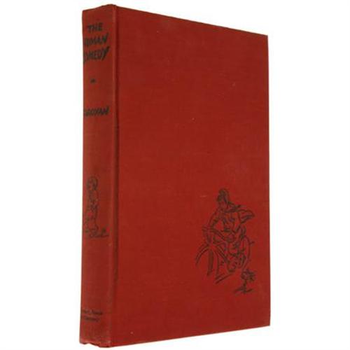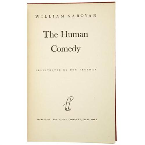 <B>William Saroyan, </B></I><B><I>The Human Comedy</B></I></B></I> (New York: Harcourt, Brace and Company, 1943), first edition, 291 pages, illustrated, red-cloth binding with black lettering and illustrations, 8vo (8.75” x 6”). Born in Fresno, California, to an Armenian immigrant couple, William Saroyan (1908-1981) wrote popular stories that provided optimism and hope during the Great Depression. <I>The Human Comedy</B></I>, published in 1943, is set in a fictional California town where a young telegraph messenger experiences the home-front realities of World War II. Saroyan originally was hired by MGM mogul Louis B. Mayer to write the drama in screenplay form, but his uncompromising attitude got him fired, and he reworked his material into a novel instead. The book, with illustrations by Don Freeman, is in very good condition with minor wear and some acidification in the endpapers.<BR><BR><b>Shipping:</b> Books & Catalogs (<a target="_blank" href="http://www.heritageauctions.com/common/shipping.php">view shipping information</a>)