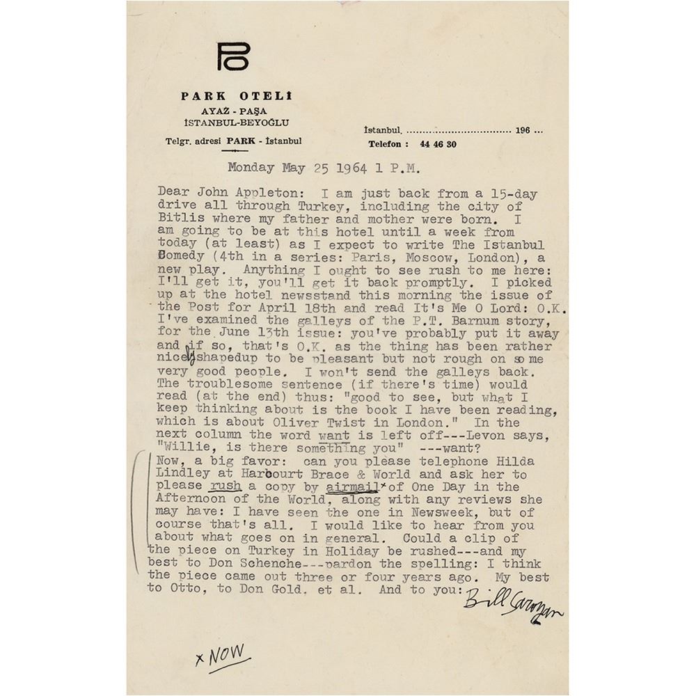 TLS signed “Bill Saroyan,†one page, 5.75 x 9, Park Oteli (Istanbul) letterhead, May 25, 1964. Letter to John Appleton, presumably his agent, written in a rambling, pressured style, but with interesting literary and personal content. In part: "I am just back from a 15-day drive all through Turkey, including the city of Bitlis where my father and mother were born. I am going to be at this hotel until a week from today (at least) as I expect to write The Istanbul Comedy…a new play…I’ve examined the galleys of the P. T. Barnum story for the June 13th issue: you’ve probably put it away and if so, that’s O.K. as the thing has been rather nicely shaped up to be pleasant but not rough on some very good people...Now, a big favor: can you please telephone Hilda Lindley at Harcourt Brtace & World and ask her to please rush a copy by airmail of One Day in the Afternoon of the World, along with any reviews she may have." Saroyan makes a few hurried corrections and embellishments to the text in his own hand, including asterisks next to "airmail" and the handwritten word "NOW" in the lower margin, which further emphasize his atypically excited state of mind. In fine condition.