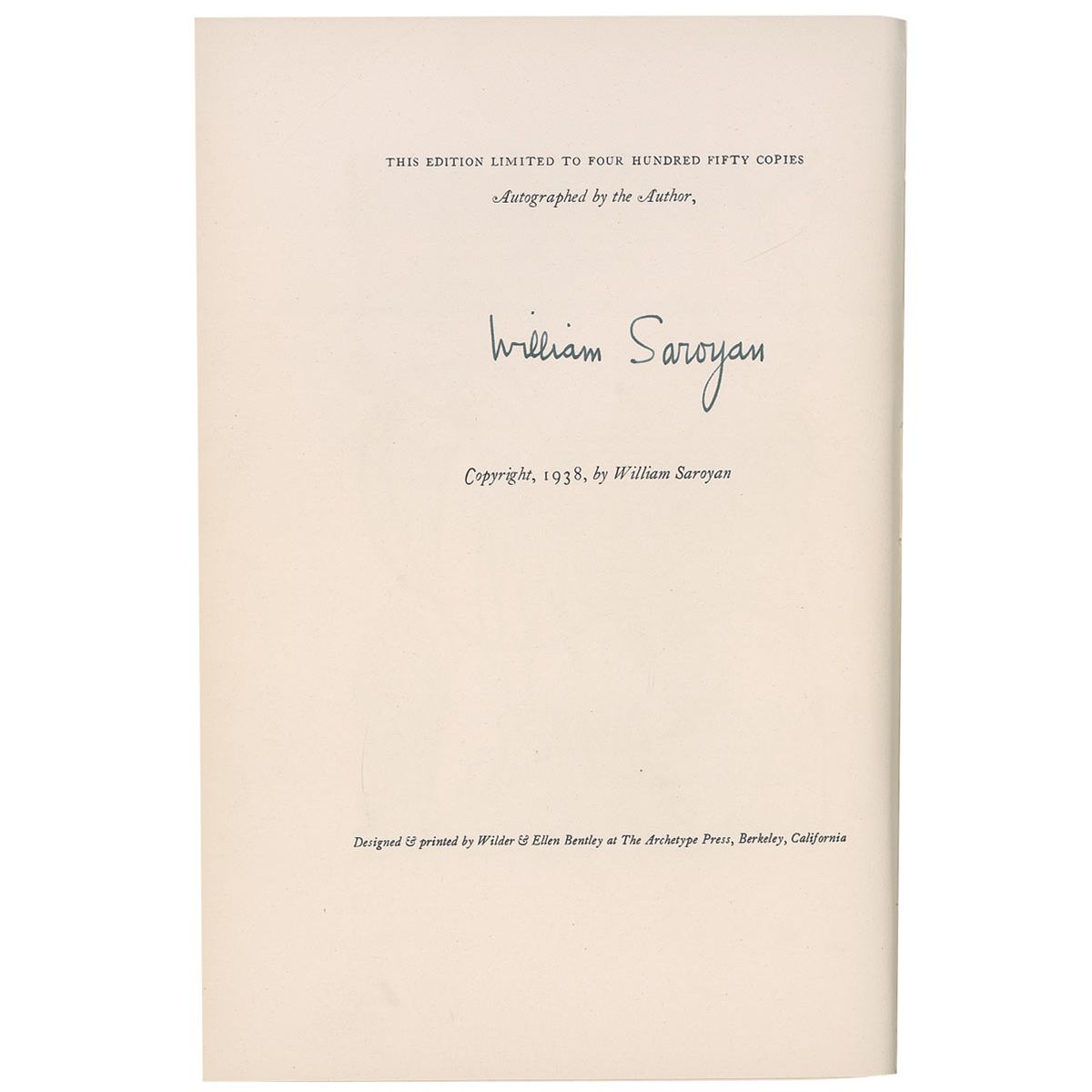 Signed book: A Native American. Limited edition first edition, 450 copies. San Francisco: George Fields, 1938. Hardcover, 7.25 x 10.75. Signed on the limitations page in ink, “William Saroyan.” A uniform block of toning to the first two opening pages and to the text block, slightly loose, but intact hinge, and some light rubbing to the front cover, otherwise fine condition.