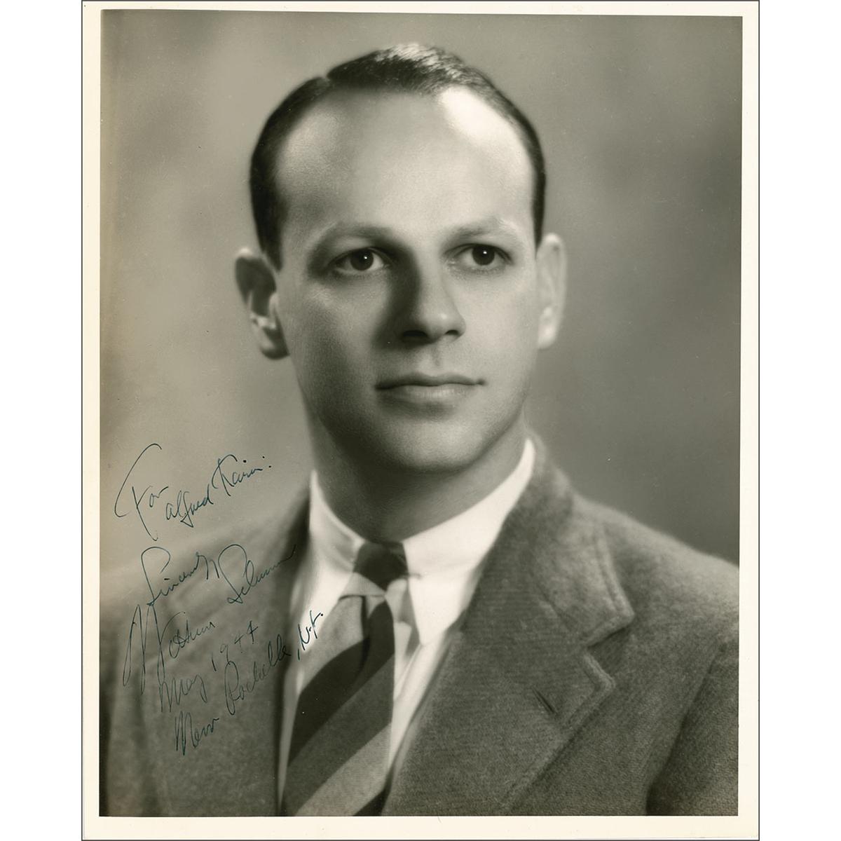 American composer (1910-1992). Vintage pearl-finish 8 x 10 photo, signed and inscribed in fountain pen “For Alfred Kairn: Sincerely, William Schuman, May 1944, New Rochelle, N.Y.” In fine condition, with a couple light creases and a bit of scattered light silvering along bottom edge.