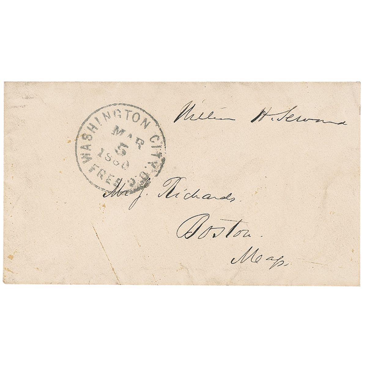 Two free frank signatures of William H. Seward and Simon Cameron (signed “Free, S. Cameron”) on individual envelopes. In fine condition, with scattered creasing and soiling to each.