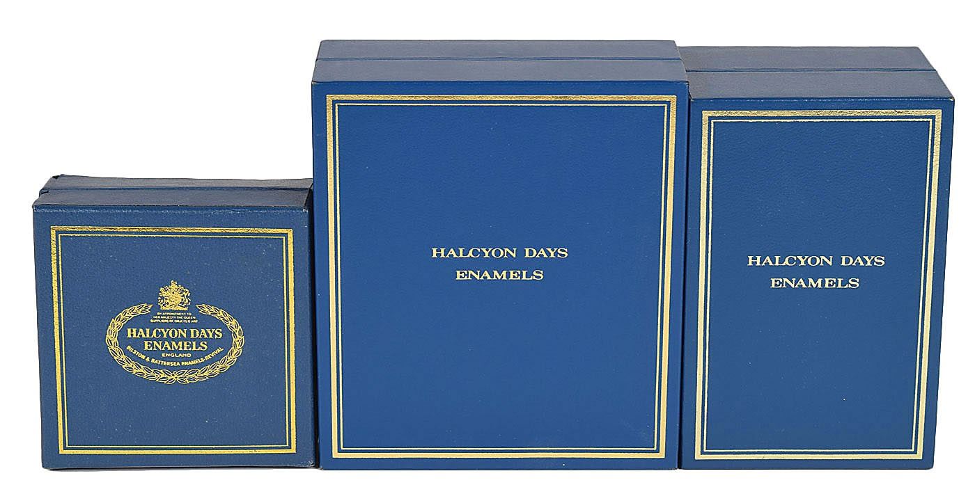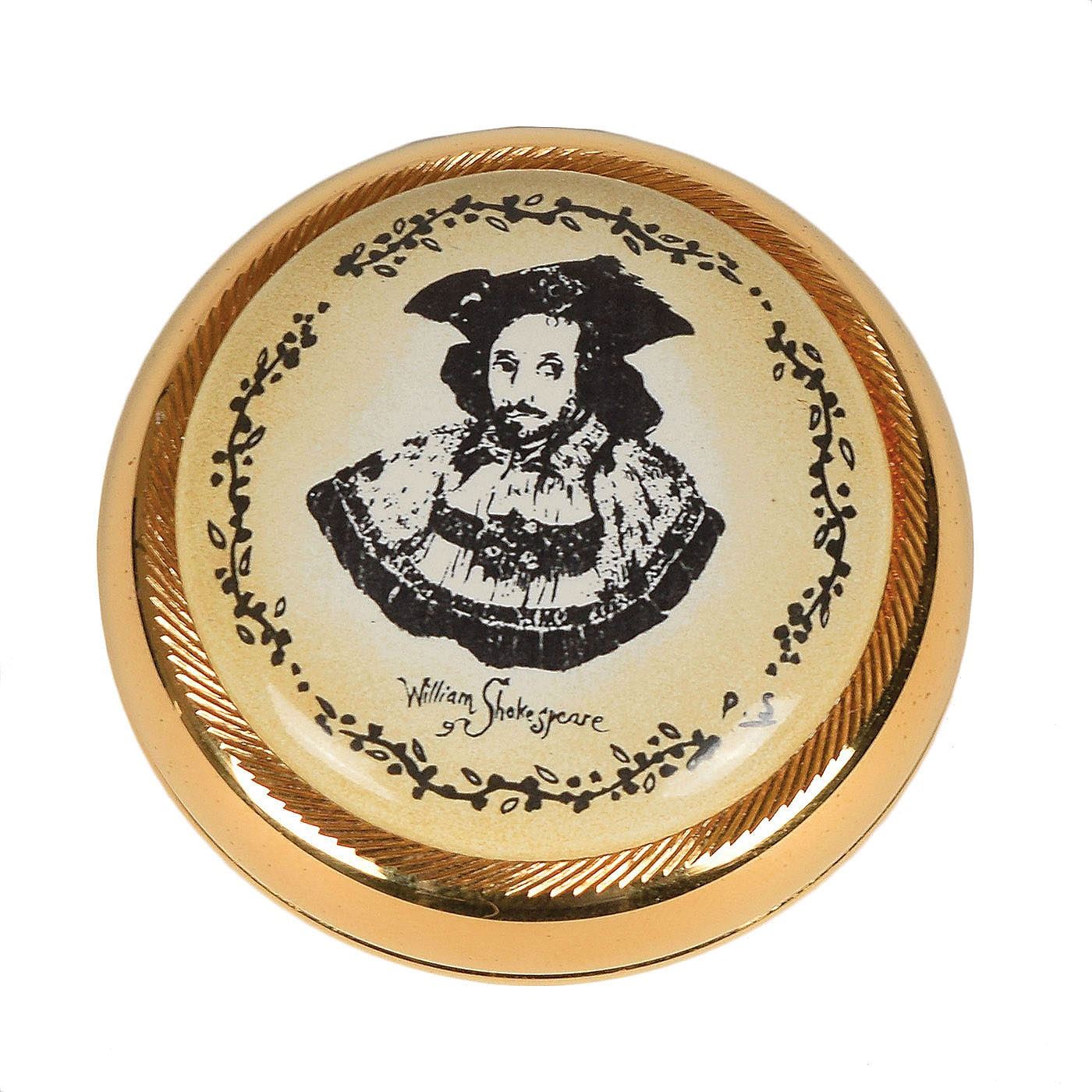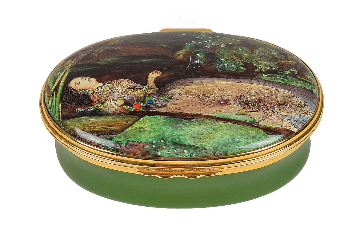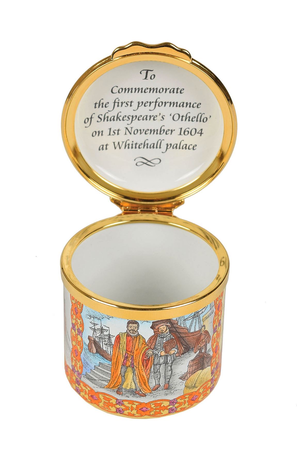 Five appealing small enameled items made by Halcyon Days in Bilston, England: a limited edition cylindrical pill box commemorating the 400th anniversary of Othello, measuring 1.75? in diameter and 1.75? tall, numbered 33/100; a limited edition oval trinket box depicting John Everett Millais's painting 'Ophelia,' measuring 2.75? x 2? x 1?, numbered 174/350; a 2? diameter paperweight featuring an enamel plaque with a portrait of Shakespeare by Philip Sutton, set into a gold-plated brass base; a limited edition cylindrical pill box commemorating the 400th anniversary of Macbeth, measuring 1.75? in diameter and 1.75? tall, numbered 40/150; and a beaker honoring Shakespeare's numerous plays, measuring 2.25? in diameter and 3.25? tall, depicting characters from the likes of King Lear, Romeo and Juliet, Twelfth Night, and others on the sides. In overall fine condition. Accompanied by all original boxes (the hinge of the paperweight's box makes the top rather cockeyed) and Halcyon Days paperwork.
