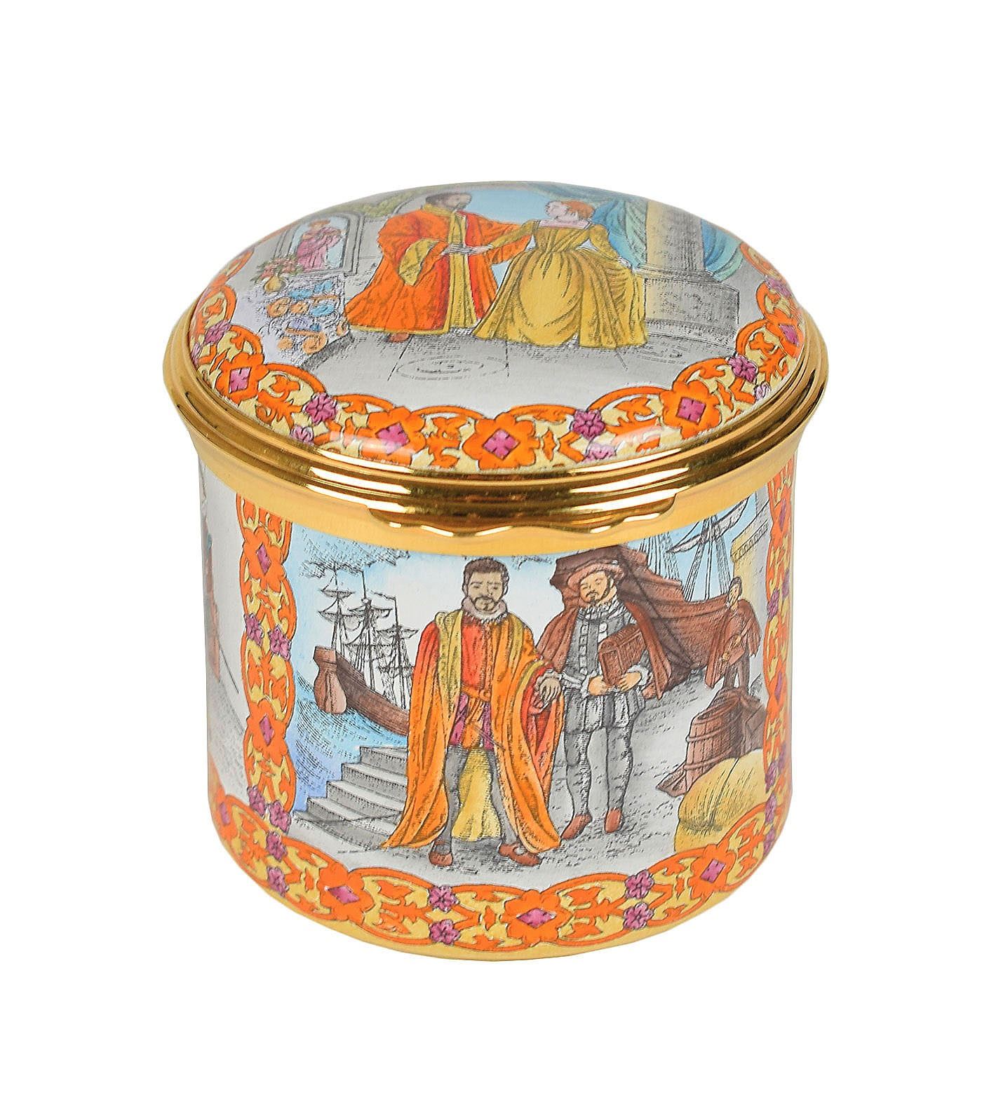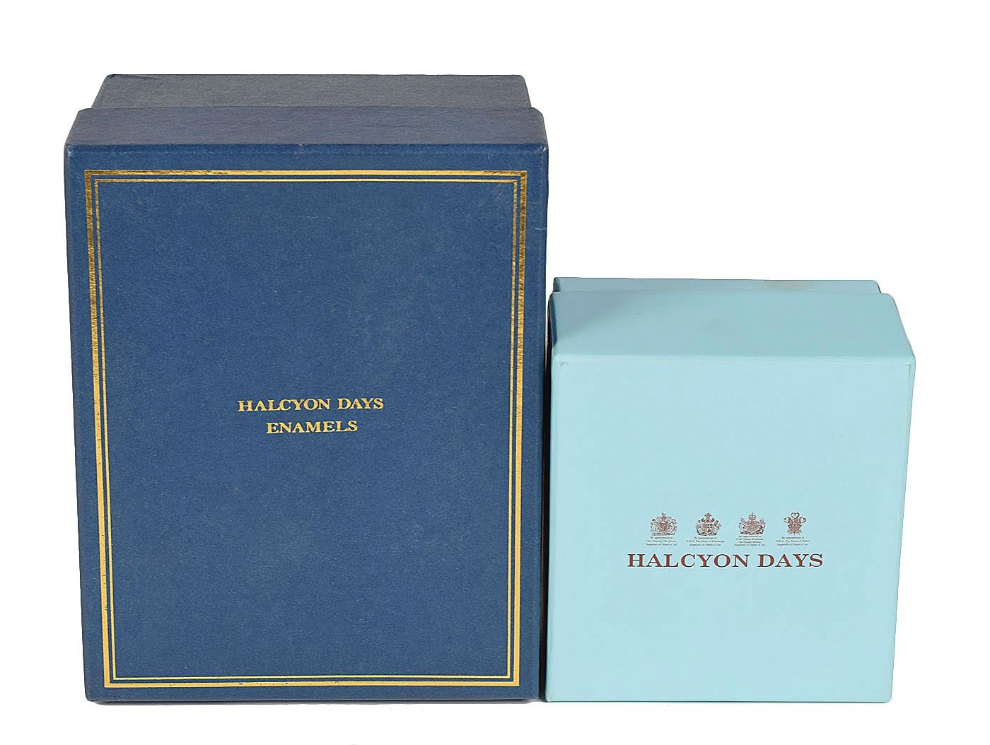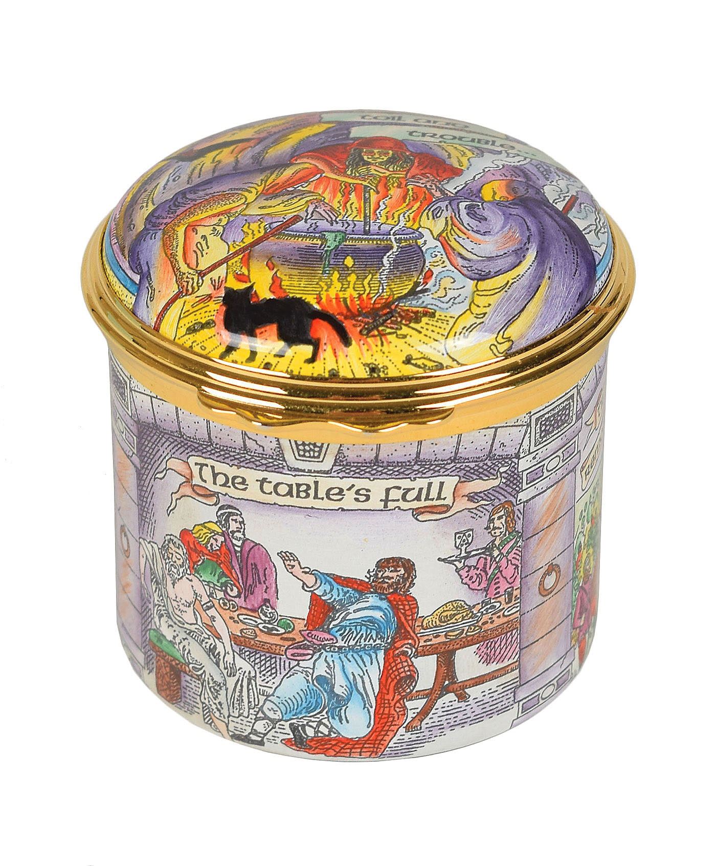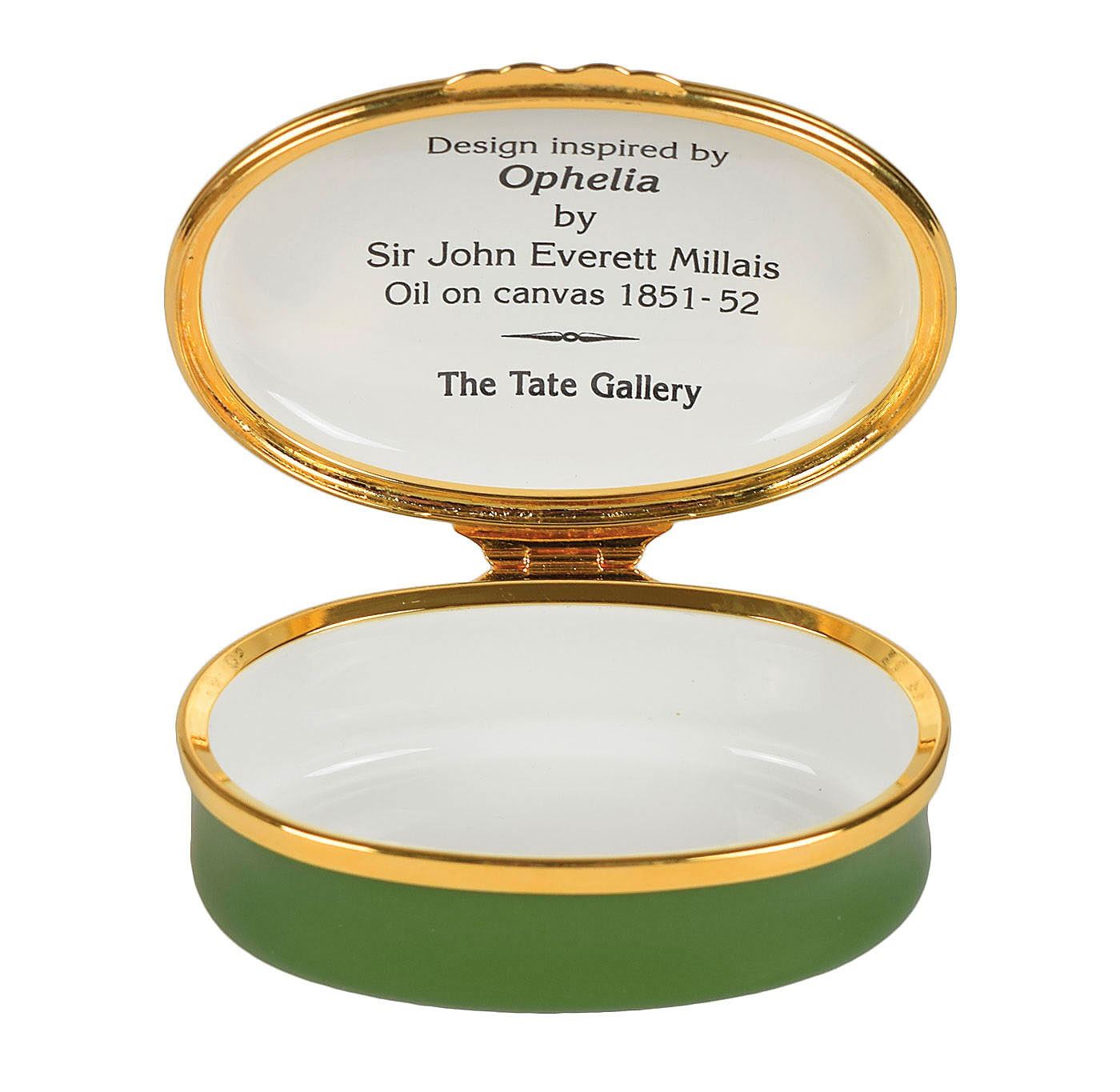 Five appealing small enameled items made by Halcyon Days in Bilston, England: a limited edition cylindrical pill box commemorating the 400th anniversary of Othello, measuring 1.75? in diameter and 1.75? tall, numbered 33/100; a limited edition oval trinket box depicting John Everett Millais's painting 'Ophelia,' measuring 2.75? x 2? x 1?, numbered 174/350; a 2? diameter paperweight featuring an enamel plaque with a portrait of Shakespeare by Philip Sutton, set into a gold-plated brass base; a limited edition cylindrical pill box commemorating the 400th anniversary of Macbeth, measuring 1.75? in diameter and 1.75? tall, numbered 40/150; and a beaker honoring Shakespeare's numerous plays, measuring 2.25? in diameter and 3.25? tall, depicting characters from the likes of King Lear, Romeo and Juliet, Twelfth Night, and others on the sides. In overall fine condition. Accompanied by all original boxes (the hinge of the paperweight's box makes the top rather cockeyed) and Halcyon Days paperwork.