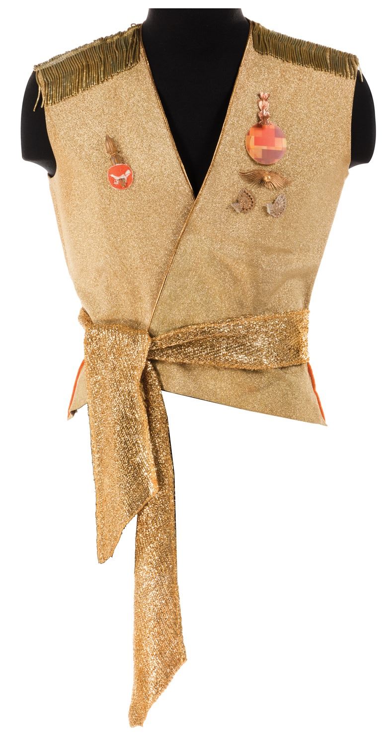 43. William Shatner "Alternate Universe Cpt. Kirk" tunic from Star Trek: The Original Series Episode "Mirror, Mirror". (Paramount TV, 1966-1969) Vintage original metallic gold lurex vest with metallic gold piping at v-neck and front closure, double-sided metallic gold fringe on shoulders, 1-embroidered patch applique on right chest, 4-embellishements on left chest (and 1-loose orange holographic disc), including 1-woven metallic gold sash. No labeling present. Retaining orange strips of loop velcro strips along lower hemline for attaching hand props (Phaser, etc.). Worn by Kirk on the Enterprise in the Mirror World, in which Star Fleet has been replaced with an evil empire. Sash is production used. In vintage very good to fine condition. Provenance: Profiles in History, HACR 2, June 1-2, 1996. Lot 760. Exhibited: California State Fair, August 1998. $40,000 - $60,000