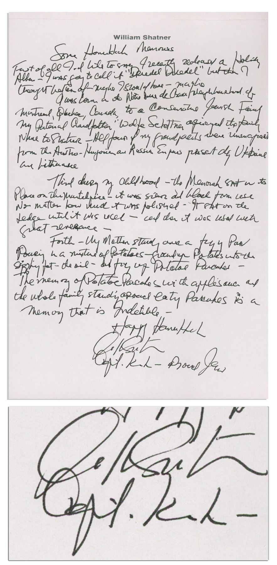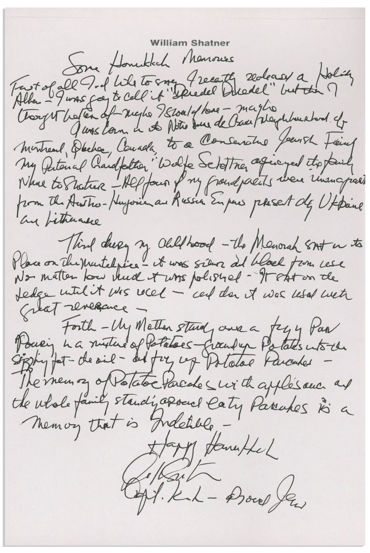 Fourth - my mother standing over a frying pan, pouring in a mixture of potatoes - ground-up potatoes into the sizzling fat - the oil - and frying up potato pancakes. The memory of potato pancakes with applesauce and the whole family standing around eating pancakes is a memory that is indelible. / Happy Chanukah William Shatner / Capt. Kirk - Proud Jew''. Single page measures 7.25'' x 10.5''. Near fine condition.