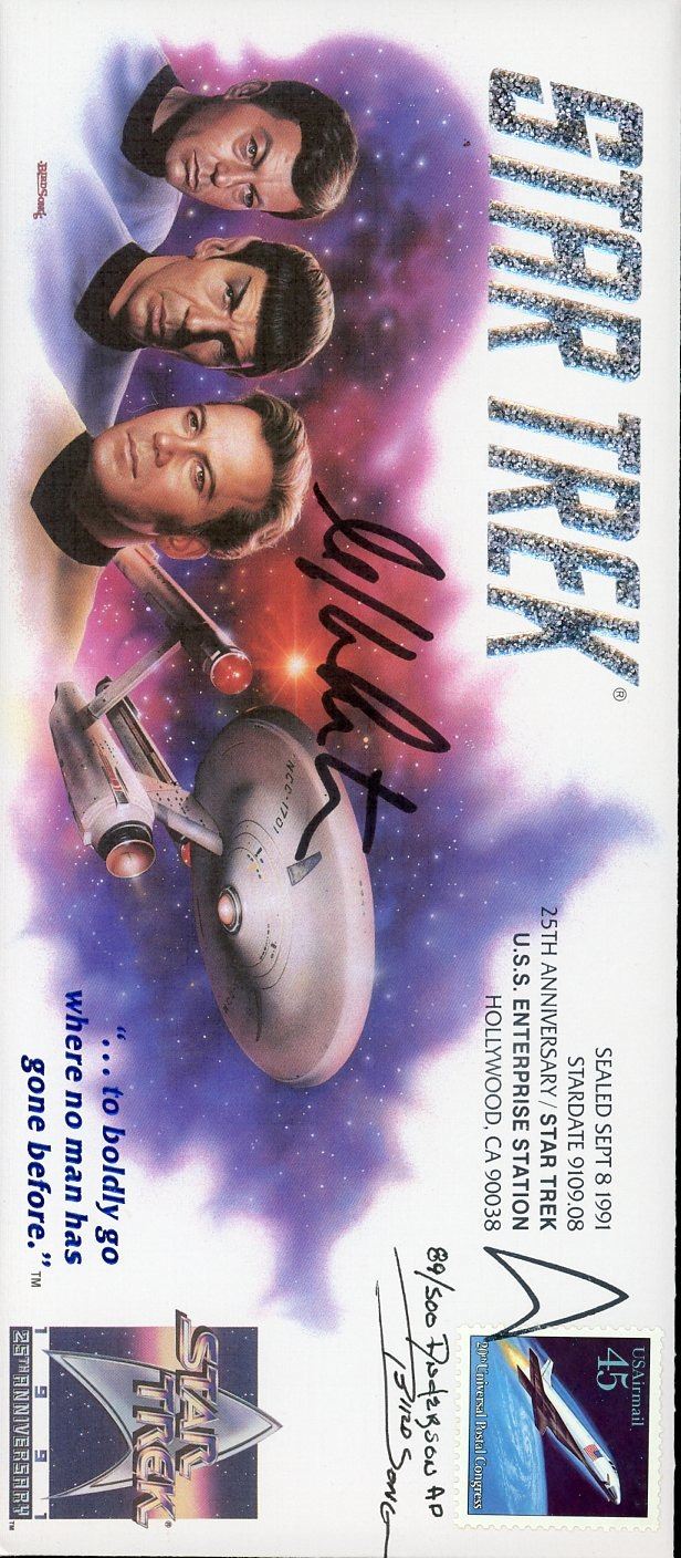 Star Trek 25th Anniversary commemorative envelope dated September 8, 1991 and numbered 89 of 500 by Bird Song signed by William Shatner and the artist. All items come with a COA and guarantee for the life of the piece.