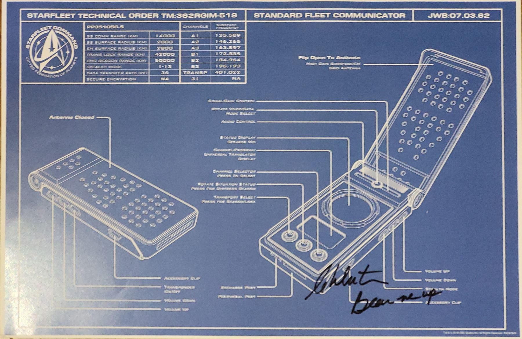 11x17 cardstock featuring the blueprint design for the communicator used in Star Trek TOS. It has been signed by William Shatner, who also added "Beam me up" under his signature. All items come with a COA and guarantee for the life of the piece.