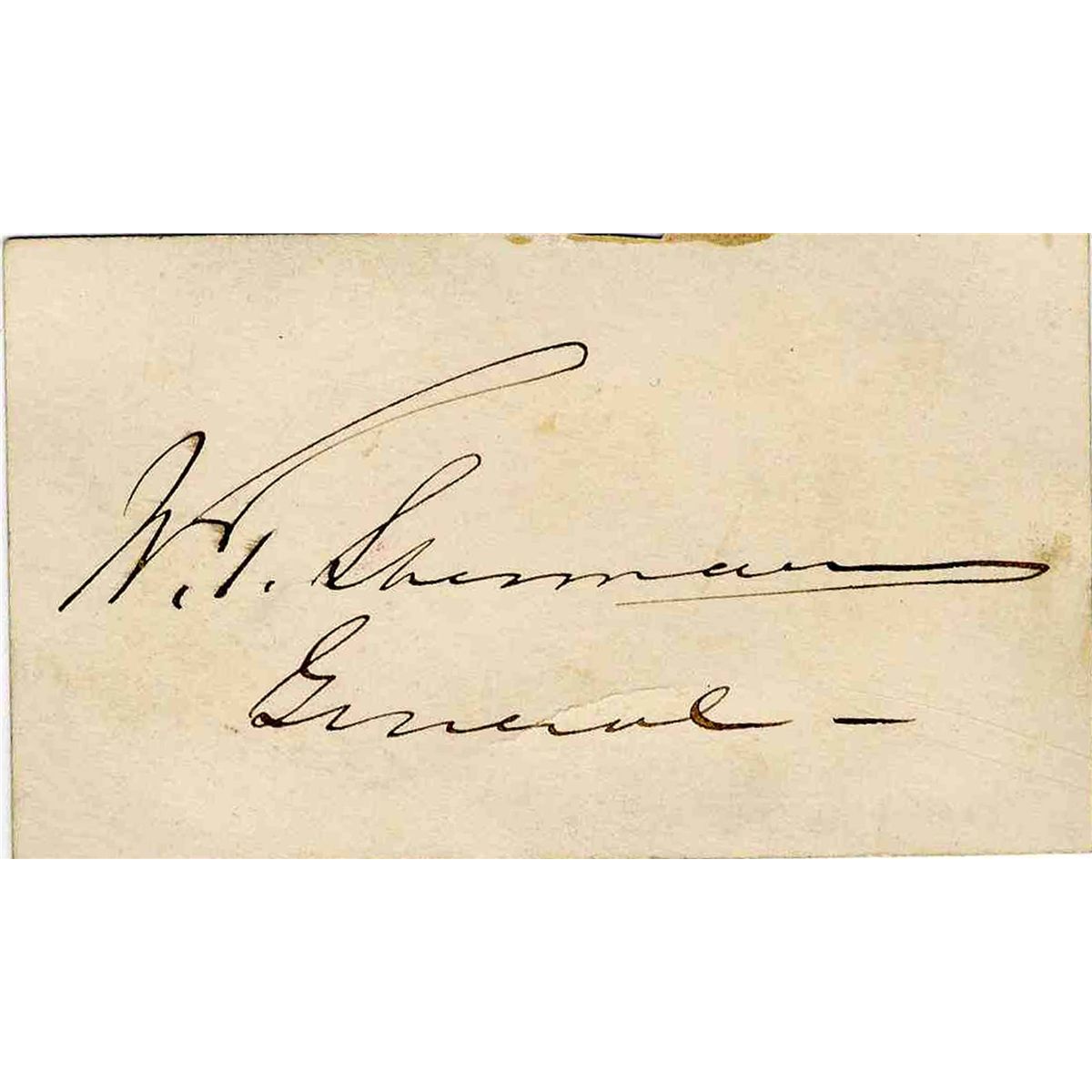 Nice signature of Civil War Union General William Sherman, signed ''W.T. Sherman General.'' Measures 3.25'' x 2''. Card once glued to a collector's album page which, though removed, has remnants remaining on verso. Small nick to upper edge of card. Overall very good condition.