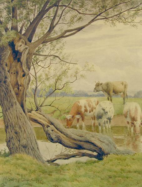 British [1854-1927] CATTLE WATERING AT A STREAM; 1914 watercolour on paper 11.75 x 9 in. (29.8 x 22.9 cm) signed & dated
