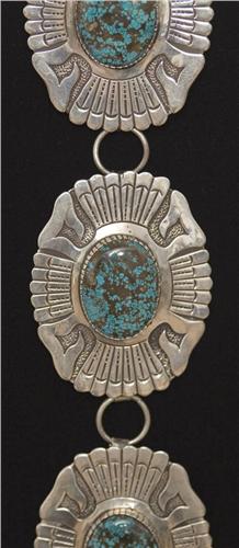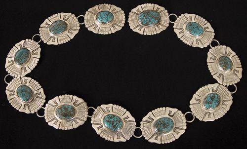 William Singer (Navajo) Sterling Silver and Turquoise Man's Concho Belt. Each concho measures 3" x 3 ¾” in diameter and belt is 48" long. (est $6,000-8,000).