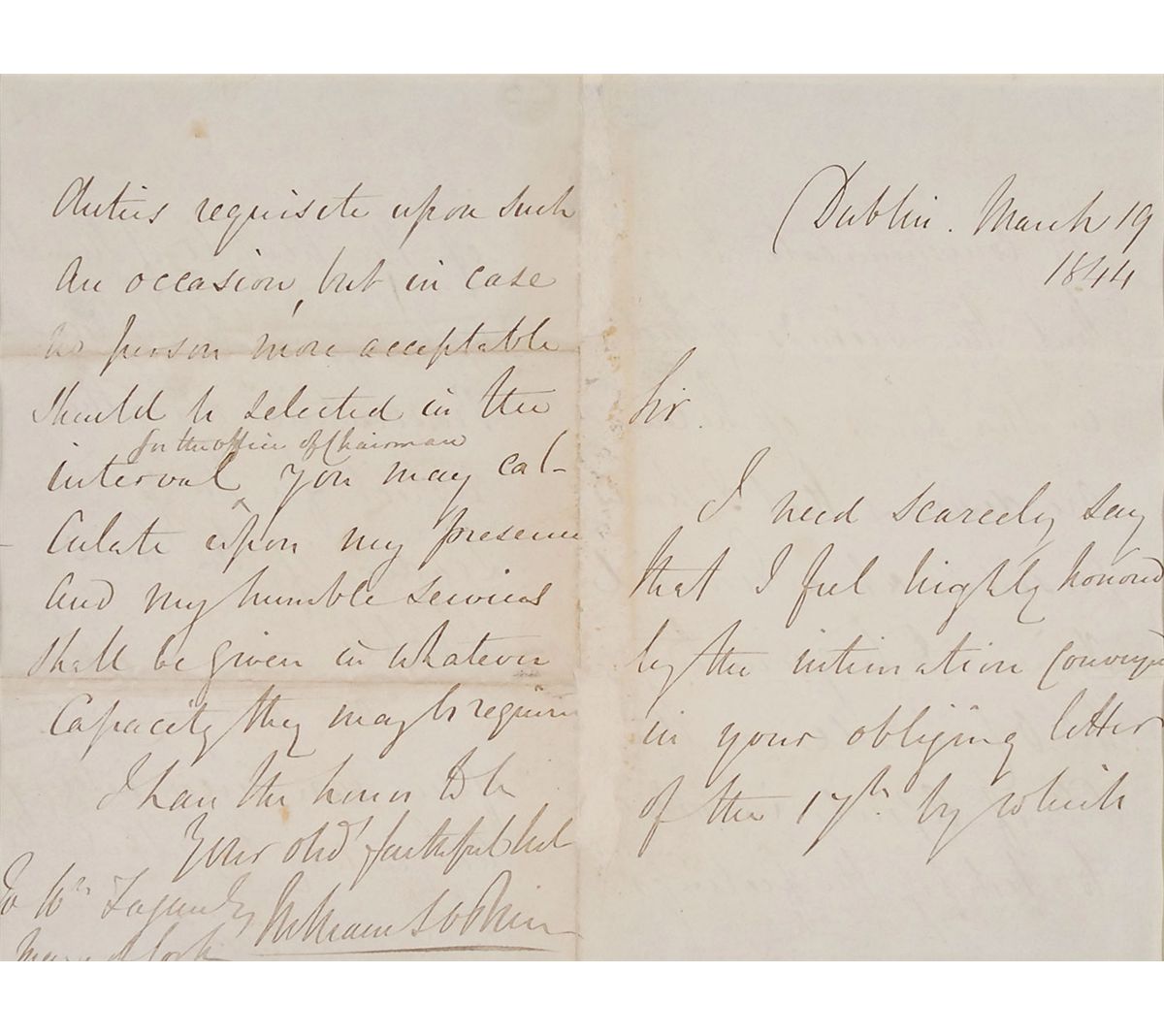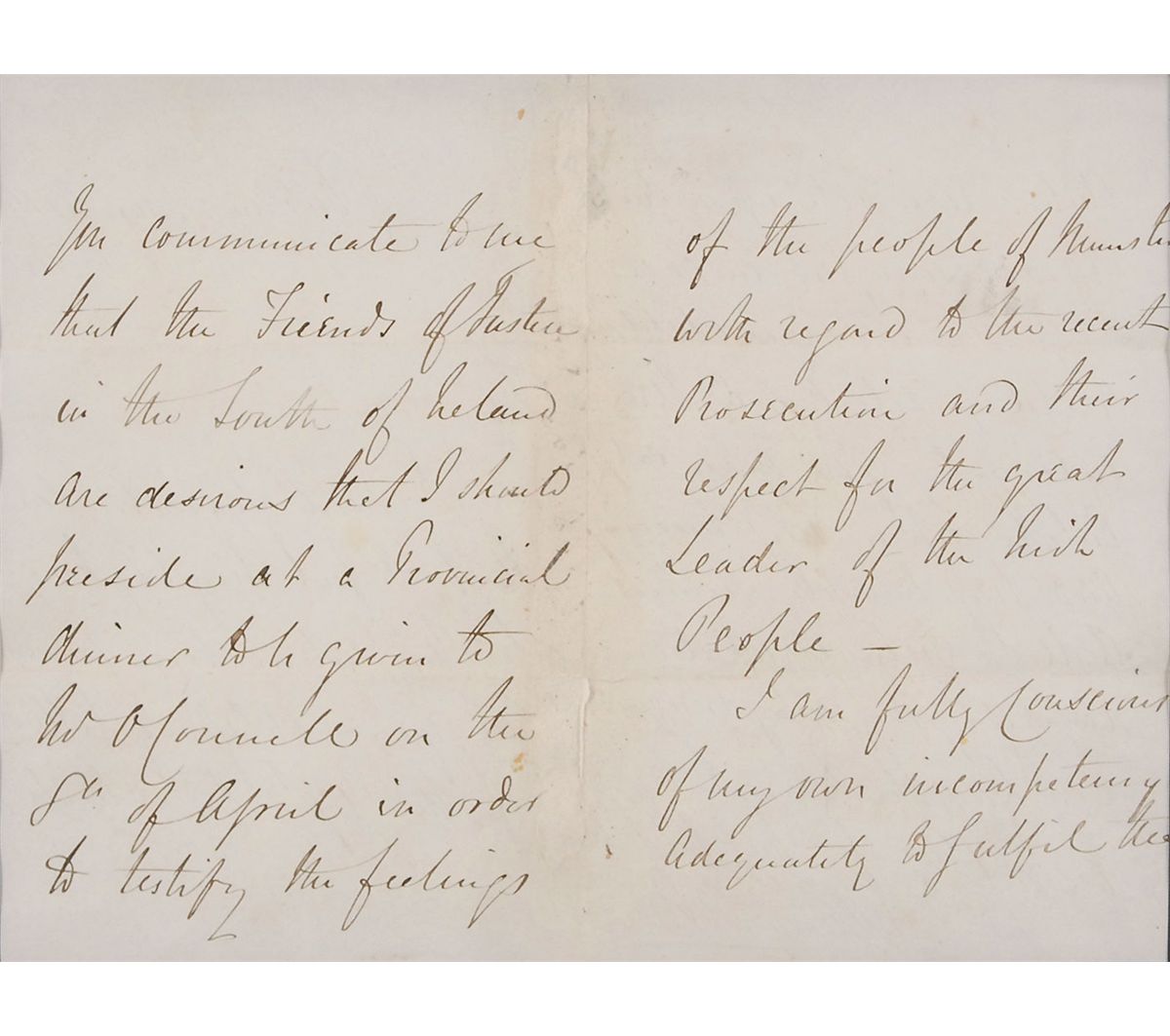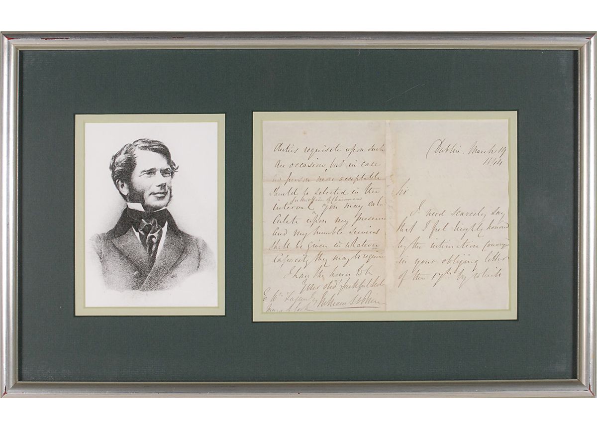 Irish Nationalist and leader of the Young Ireland movement (1803–1864). ALS signed “William S. O’Brien,” four pages on two adjoining sheets, 4.5 x 6.75, March 19, 1844. Letter to the mayor of Cork. In part: “I feel highly honored by the invitation…by which you communicate to me that the Friends of Justice in the South of Ireland are desirous that I should preside at a Provincial dinner to be given to Mr. O’Connell on the 8th of April in order to testify the feelings of the people of Munster with regard to the recent Prosecution and their respect for the great Leader of the Irish people. I am fully conscious of my own incompetency adequately to fulfill the duties requisite upon such an occasion, but in case no person more acceptable should be selected in the interval for the office of Chairman, you may calculate upon my presence and my humble services shall be given in whatever capacity they may be required.” Nicely double-matted and framed with an engraving to an overall size of 22 x 13.5, with a window on the reverse for viewing of the opposing side of the letter. Mounting remnants at adjoining fold, otherwise fine condition.