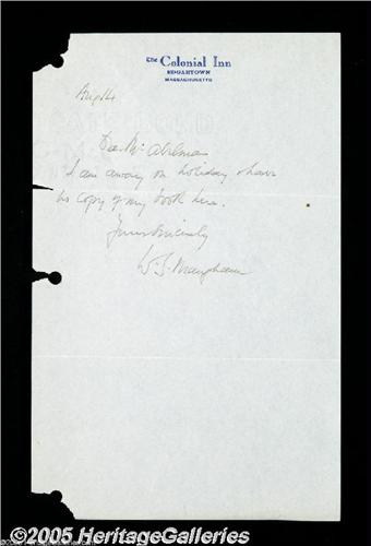 <B>William Somerset Maugham Autograph Note</B></I> Autograph note signed, "W. S. Maugham", 6" x 9.5", Edgartown, Massachusetts, August 14, n.y. advising his recipient that, "I am away on holiday and have no copy of my book here..." File holes at left margin with several small losses, otherwise clean and bright. (PSA/DNA lacks sufficient comparable examples to render an opinion on this item. While we believe it to be authentic as described, it is thus sold without certification). <I>Accompanied by COA from PSA/DNA.</B></I>