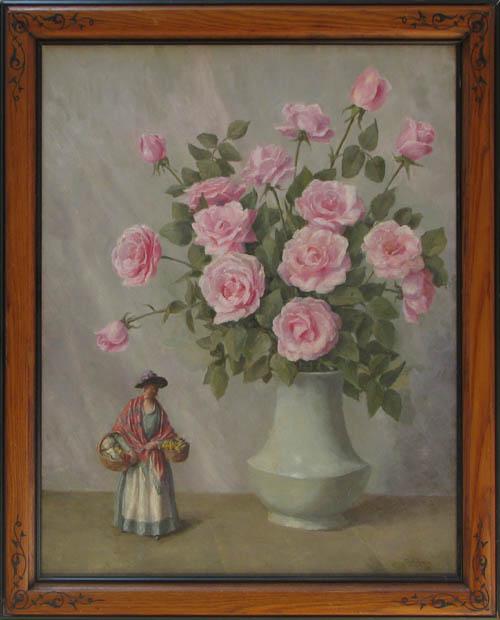 Title: Still Life of Pink Roses with English Porcelain Figure