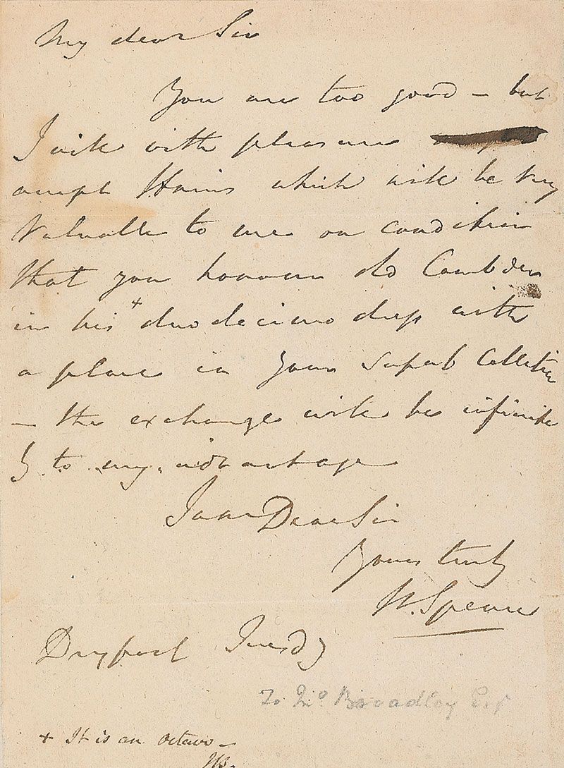 British economist and entomologist (1783–1860). ALS signed “W. Spence,” one page, 4.5 x 6, no date. Letter to Jno. Bradley. In part: “I will with pleasure accept Harris which will be very valuable to me on condition that you however do Caulder in his duo decimo cup with a place in your superb collection.” Letter is inlaid to a slightly larger off-white sheet. Scattered toning and a couple small pencil notations, otherwise fine condition.