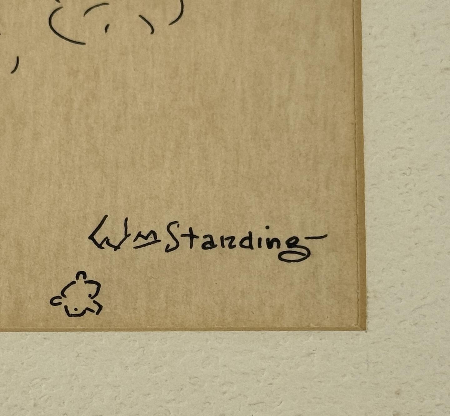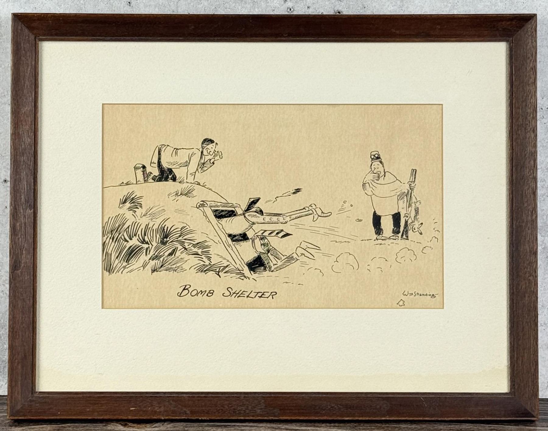 Title is Bomb Shelter. 6 1/2" by 10 1/2" unframed. 12" by 16" framed. Pen and Ink Drawing. William Standing (1904 - 1951) was active/lived in Montana. William Standing is known for Horse, landscape, Indian, genre. William Standing was born July 27, 1904 in Oswego, Montana. He was a Native American, member of the Assiniboine Tribe. Educated at the Wolf Point Mission School and, from 1920-24, at the Haskell Indian School in Lawrence where he received his formal art instruction. Standing was one of the five Kiowa Indians who became special students at the Univ. of Oklahoma under the guidance of Oscar Jacobson during the 1920s. After attending Haskell Institute, he worked as an interior decorator in Kansas. Standing is best known for his humorous sketches published as postcards, and he was also adept in oil, watercolor, and clay. During the 1930s, in collaboration with James Long, he produced a book, The Land of the Nakoda. This volume, an in-depth sketch study of the Assiniboine tribe, is the focal point of the greatest body of Standing's works. He died on June 27, 1951 in Oswego, Montana.