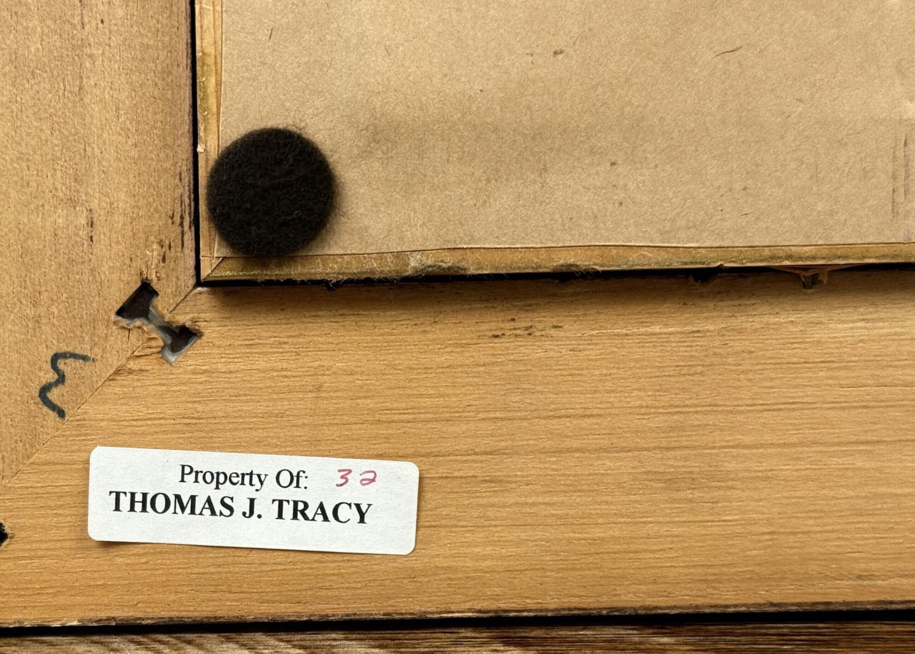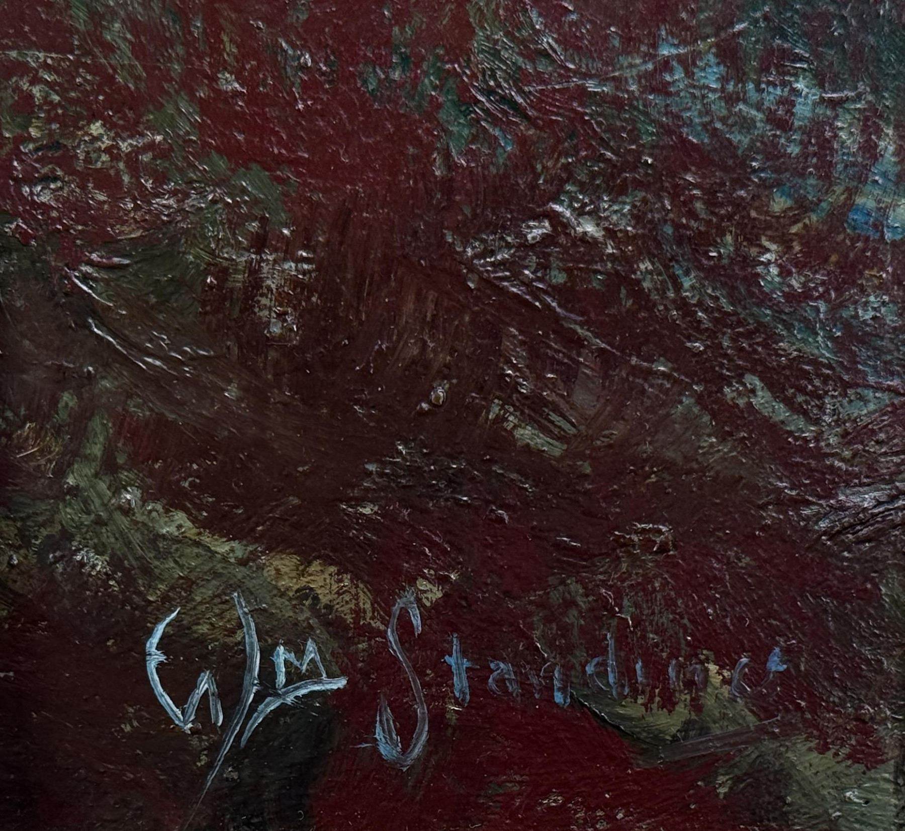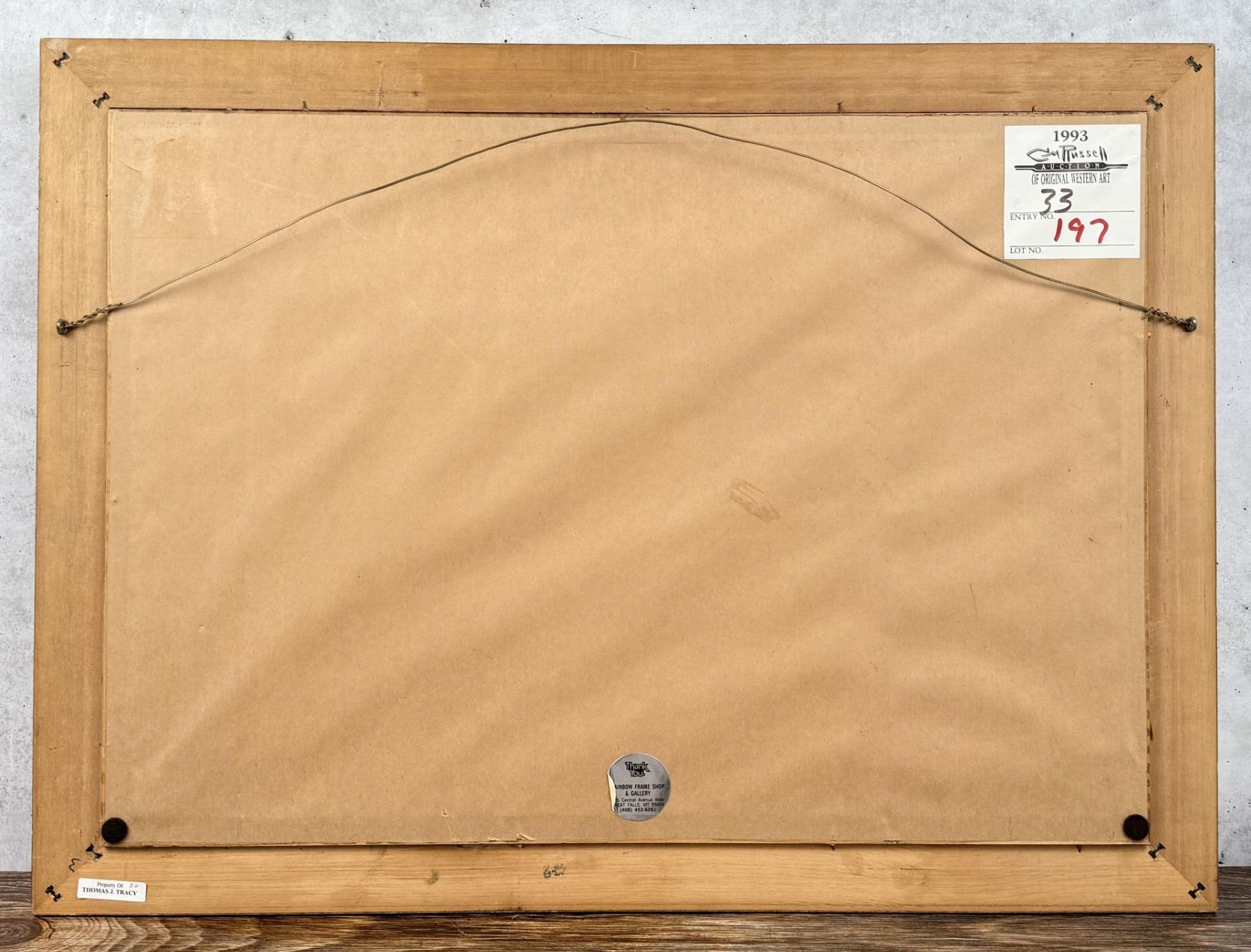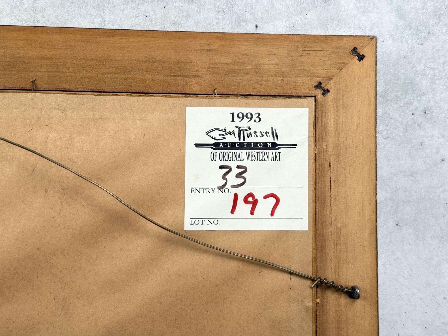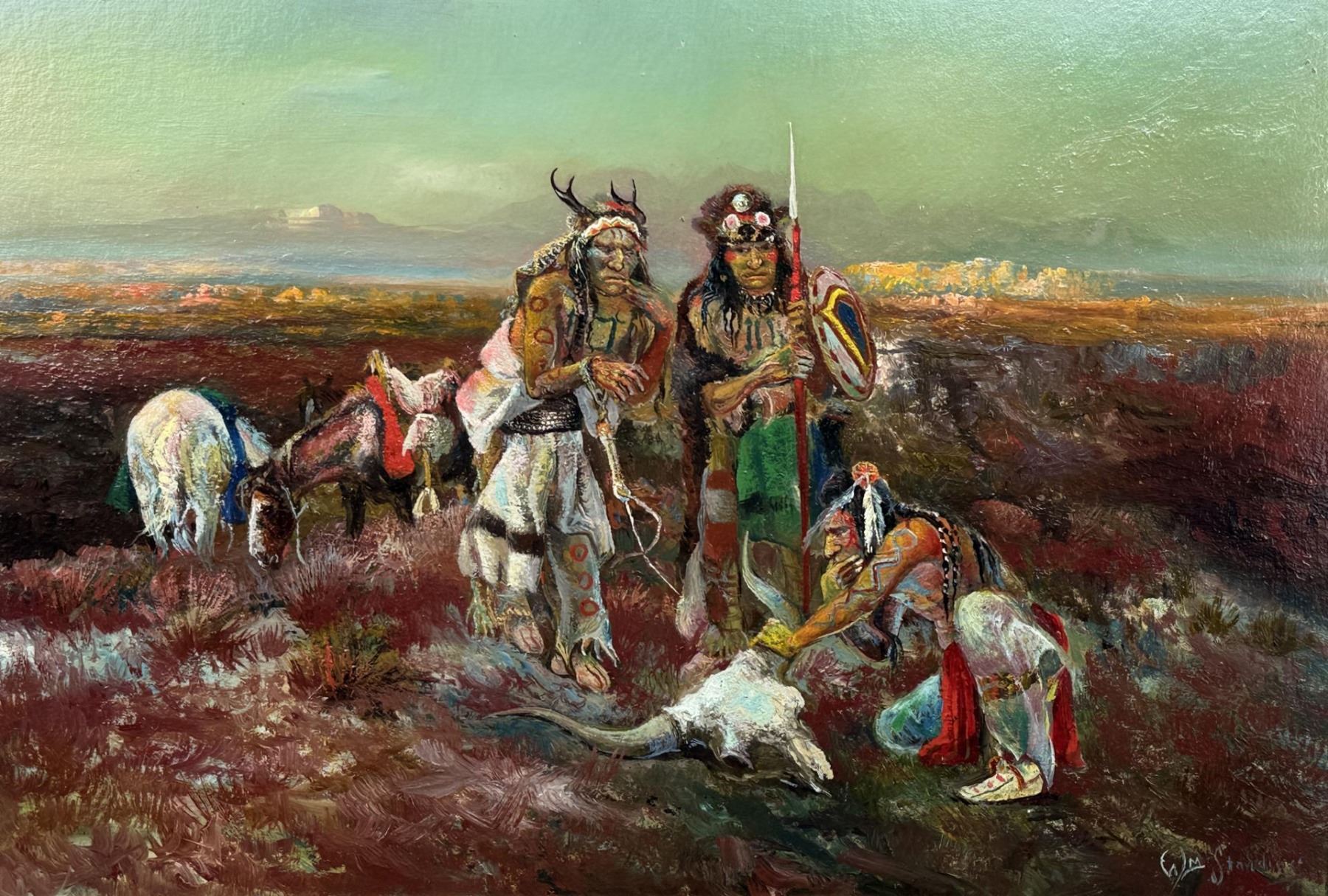 Title is The Buffalo Skull. 18" by 26" unframed. Measures 31" by 23" framed. Oil on Board. Provenance: The Estate of Thomas J. Tracy, Laguna Beach, California. The CM Russell Auction, 1993, Lot 197. William Standing (1904 - 1951) was active/lived in Montana. William Standing is known for Horse, landscape, Indian, genre. William Standing was born July 27, 1904 in Oswego, Montana. He was a Native American, member of the Assiniboine Tribe. Educated at the Wolf Point Mission School and, from 1920-24, at the Haskell Indian School in Lawrence where he received his formal art instruction. Standing was one of the five Kiowa Indians who became special students at the Univ. of Oklahoma under the guidance of Oscar Jacobson during the 1920s. After attending Haskell Institute, he worked as an interior decorator in Kansas. Standing is best known for his humorous sketches published as postcards, and he was also adept in oil, watercolor, and clay. During the 1930s, in collaboration with James Long, he produced a book, The Land of the Nakoda. This volume, an in-depth sketch study of the Assiniboine tribe, is the focal point of the greatest body of Standing's works. He died on June 27, 1951 in Oswego, Montana.