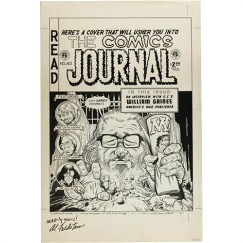 <B>William Stout - The Comics Journal #80, William Gaines Cover Original Art (Fantagraphics, 1983).</B></I> Good lord -- (choke)! In this chilling scene, publisher William Gaines claws his way from a burial plot in true EC "New Trend" fashion. William Stout's superb portrait captures all the iconoclastic character of this comic book legend, who was showcased in a lengthy <B>Comics Journal </B></I>Interview. This cover has an image area of 13.5" x 18.5", and the art is in Excellent condition. This piece was signed by Al Feldstein and William Stout in its lower border.<BR><BR><b>Shipping:</b> Flat Material, Large (<a target="_blank" href="http://www.heritageauctions.com/common/shipping.php">view shipping information</a>)