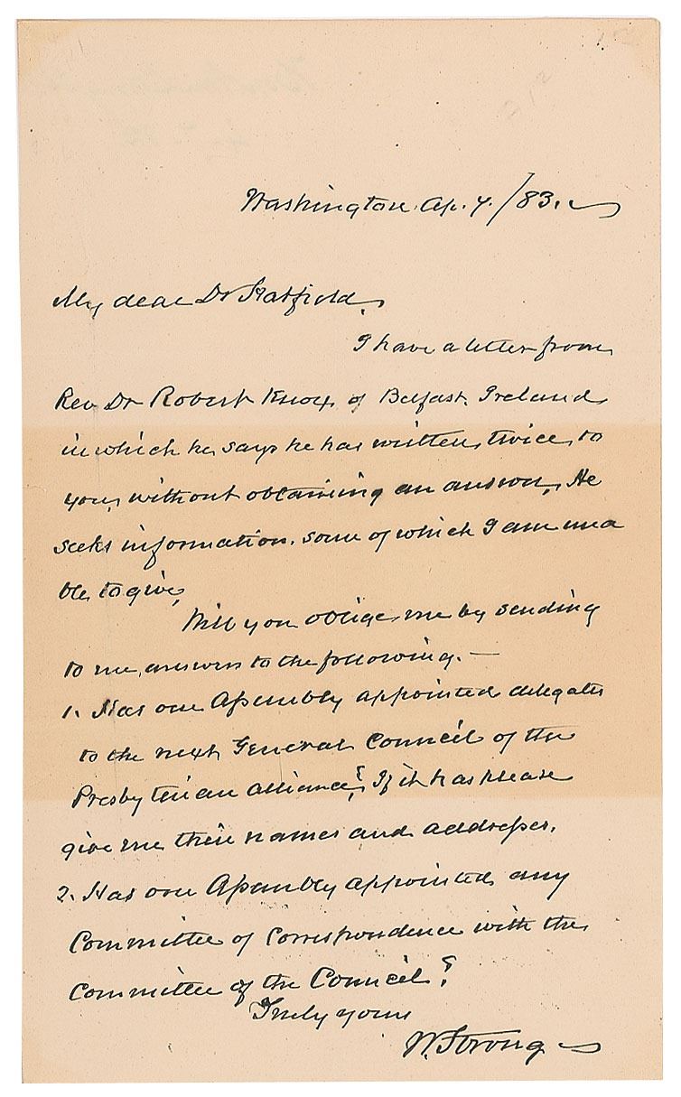 ALS signed “W. Strong,” one page, 4.75 x 8, April 7, 1883. Letter to Dr. Hatfield, in part: "I have a letter from Rev. Dr. Robert Knox of Belfast, Ireland in which he says he has written twice, to you, without obtaining an answer. He seeks information, some of which I am unable to give. Will you oblige me by sending to me, answers to the following—1. Has our Assembly appointed delegates to the next General Council of the Presbyterian Alliance? If it has please give me their names and addresses. 2. Has our Assembly appointed any Committee of Correspondence with the Committee of the Council?" In fine condition, with a block of light toning over the center of the letter. Accompanied by an engraved portrait bearing a facsimile signature.