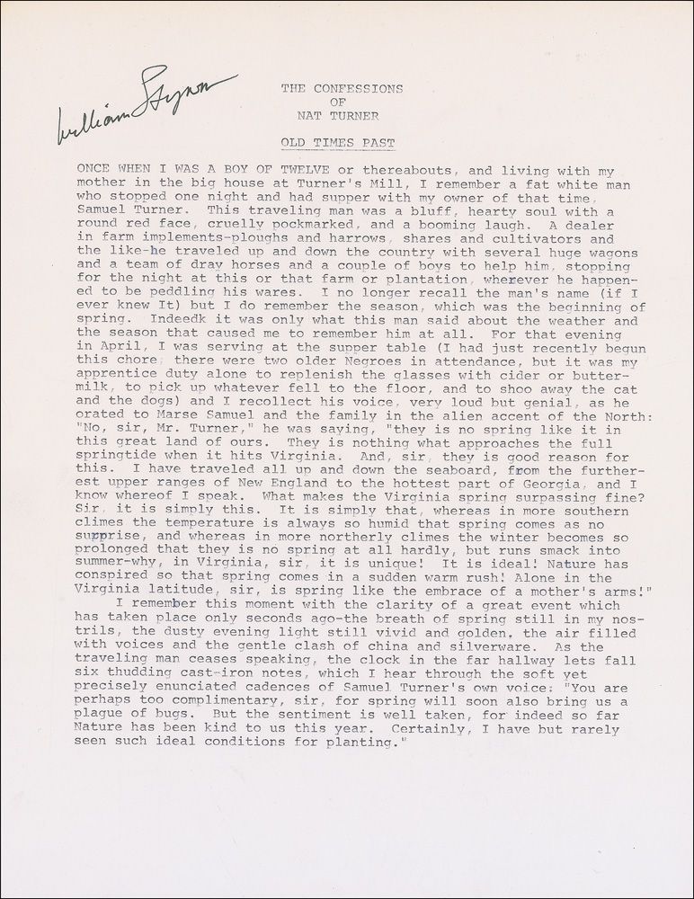 Souvenir typescript, one page, 8.5 x 11, from his Pulitzer Prize-winning novel, Confessions of Nat Turner, signed at the top in black felt tip. In fine condition, with mild toning to the top.