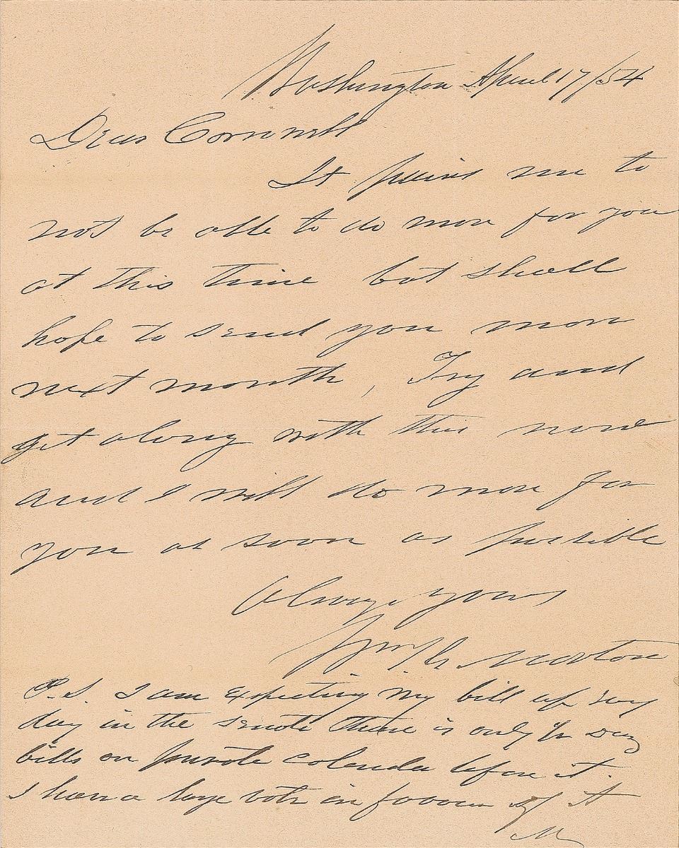 ALS signed “Wm. T. G. Morton,” one page, 7 x 8.75, April 17, 1854. Letter to his attorney Horace Cornwall, in full: "It pains me not to be able to do more for you at this time but shall hope to send you more next month. Try and get along with this now and I will do more for you as soon as possible…P.S. I am expecting my bill up any day in the Senate. There is only 1/2 dozen bills on private calendar before it. I have a large vote in favor of it." In fine condition.