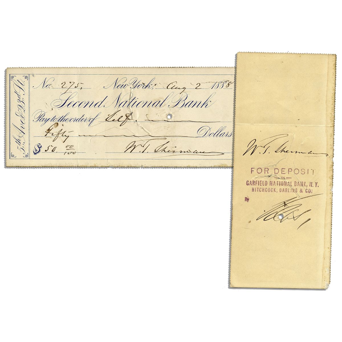 William Tecumseh Sherman check twice-signed. Dated 2 August 1888, Sherman's check to his ''Self'' is signed, ''W. T. Sherman'' on the front and endorsed likewise on verso. Check in the amount of $50.00 is from the Second National Bank. Measures 7.25'' x 3''. Closed incisions at center and an additional countersignature to verso, else near fine.