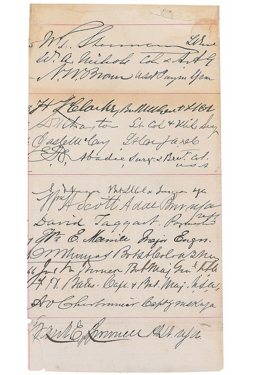 Ink signature, “W. T. Sherman, Lt. Genl.,” on an off-white 3.5 x 6.75 sheet. Also signed by a slew of members of his staff: William Augustus Nichols, Nathan W. Brown, Henry Francis Clarke, Lewis M. Dayton, James C. McCoy, Eugene H. Abadie, Anthony Heger, William H. Scott, David Taggart, William Emery Merrill, Charles W. Thomas, John Wesley Turner, Francis Henry Bates, Andrew V. Cherbonnier, and Frank E. Brownell. Professionally inlaid into a larger off-white sheet. Scattered toning and a small tape-repaired tear to the top, otherwise fine condition.