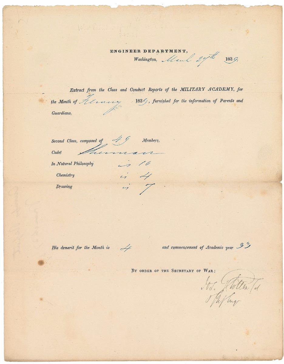 Partly-printed document, one page, 7.75 x 10, March 27, 1839. Report from the Engineering Department of the US Military Academy, headed, “Extract from the Class and Conduct Reports of the Military Academy, for the Month of February 1839, furnished for the information of Parents and Guardians.” The report card lists his class ranks as follows: “Second Class, composed of 49 Members, Cadet Sherman, In Natural Philosophy is 10, Chemistry is 4, Drawing is 7. His demerit for the Month is 4 and commencement of Academic year 33.” Signed at the conclusion by General Joseph Gilbert Totten. In fine condition, with a small split along one of the intersecting folds.