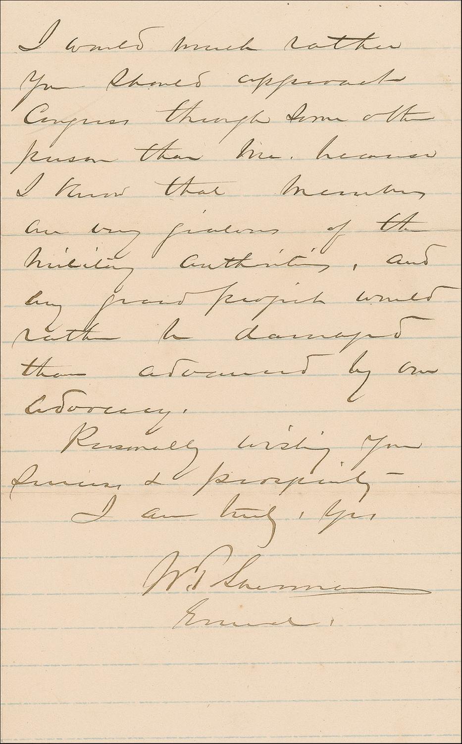 ALS signed “W. T. Sherman, General,” three pages, lightly-lined on two adjoining sheets, 5 x 8, Headquarters Army of the United States letterhead, January 27, 1873. Letter to Joseph Shepard. In part: “Mrs. Bowman has kindly sent me your letter…with the map and various newspaper slips, illustration of your proposition to build an inland canal from the mouth of the Rio Grande to Port Royal, SC. Of course here I have the opportunity of watching the various schemes which are daily passed on the attention of Congress…the papers filled…connected with the building the Great Railway to California it would be worse than idle to ask Congress to entertain any proposition however meritorious. Again, before discussing proposals for Great Canals, and Railways the political and Industrial condition of the South must be answered and this seems to be a hard job. I would much rather you should approach Congress through some other person than me because I know that members are very jealous of the Military authorities, and any grand project would rather be damaged than advanced by our advocacy…" A couple partial separations along horizontal folds, and a uniform shade of mild toning to all pages, otherwise fine condition. An interesting look at Sherman’s tenuous time as Commanding General of the Army.