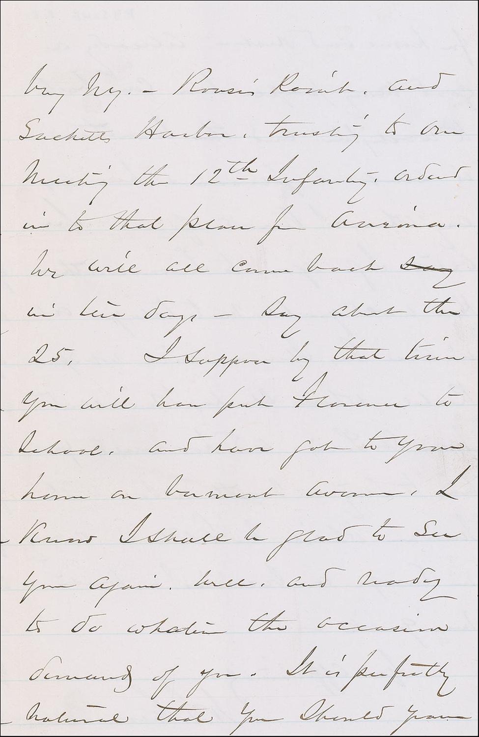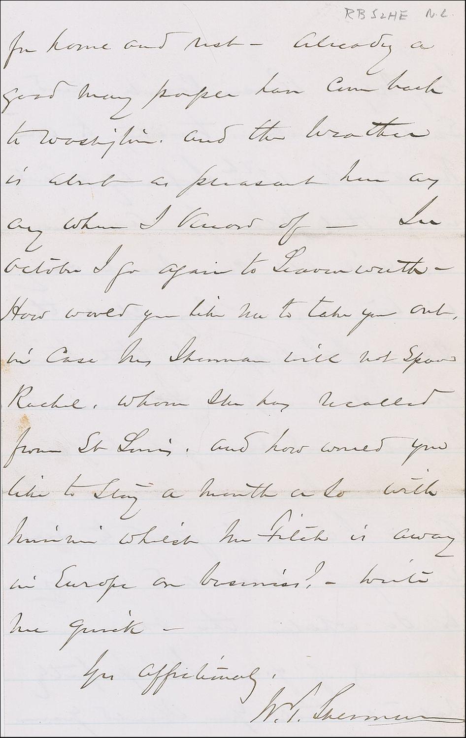ALS signed “W. T. Sherman,” four pages, lightly-lined on two adjoining sheets, 5 x 8, September 6, 1882. Letter to Mrs. Audenried, widow of his former aide-de-camp, Col. Joseph C. Audenried. In part: “I was of course glad to get your good letter of Sept 3 and…when from it I learned of the great danger you had been in and were safe out of – You seem destined to be tried. You did not give me the name of that Suitor who wanted you to share his ten thousand a year at Kansas City…on Tuesday next by the 2 PM train she & I, Genl & Mrs. Tidball will start for Boston. Stay there the 13th then go to Lake Winnipesaukee for a soldiers meeting of 14 & 15, then to the White Mountains for a day or teo. Across to Plattsburg…trusting to our meeting the 12th Infantry…It is perfectly natural that you should yearn for your home and rest. Already a good many paper has come back to Washington ad the weather is about as pleasant as any I know of. In October I go again to Leavenworth. How would you like me to take you out in case Mrs. Sherman will not spare Rachel…Write me quick.” In fine condition.