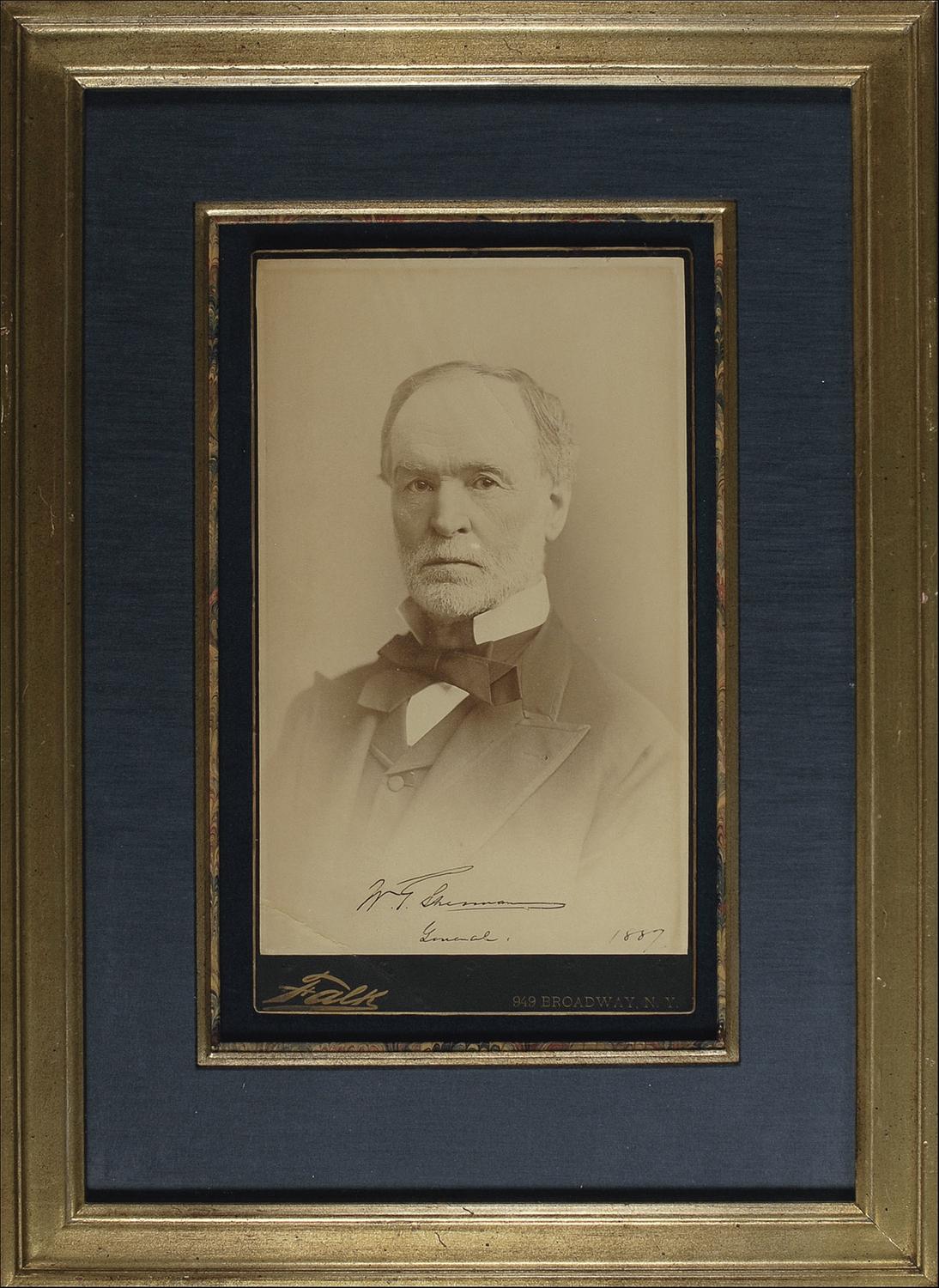 Fabulous and crystal-clear original 7.5 x 13 imperial bust portrait of Sherman in suit and bow tie, taken by Falk Studios of New York (and so stamped at the bottom), signed in the lower portion of the image in black ink, “W. T. Sherman, General 1887.” Triple cloth matted and framed to an overall size of 16 x 22. Two creases—one to lower left corner and one extending into Sherman’s forehead—otherwise fine, clean condition. At the time Sherman signed this portrait, the former general had only been retired from army life for three years and was living in New York City—and was undoubtedly familiar with Falk and his work. It is likely that this image was signed during one of Sherman’s many visits to the New York theater scene, or via his role as a colorful speaker at one of the numerous dinners and banquets to which he had been invited.