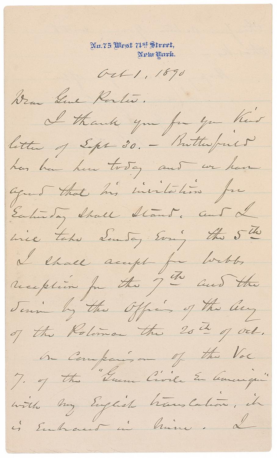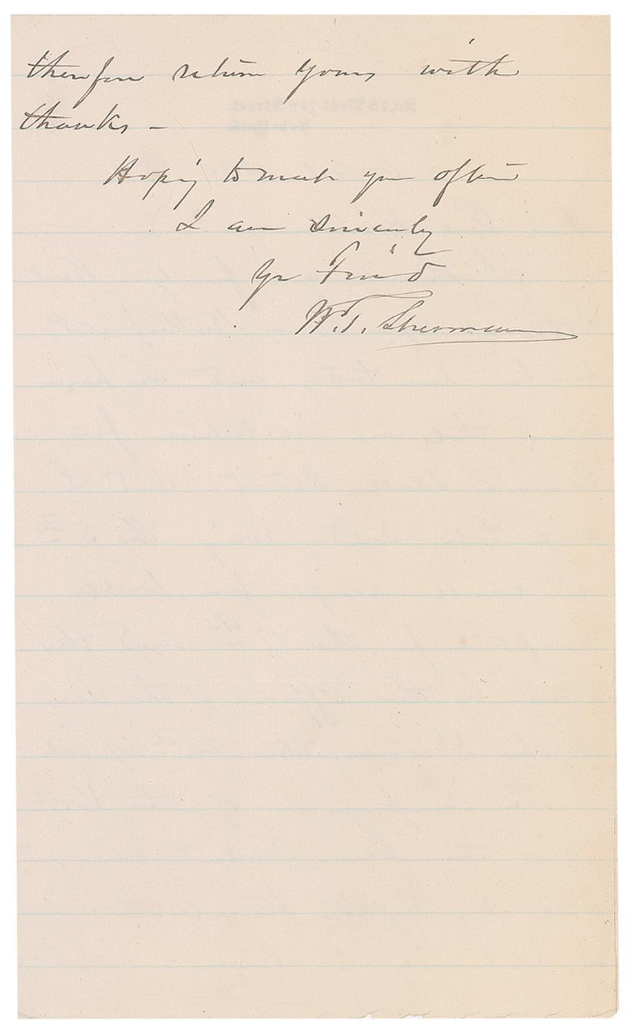 ALS signed “W. T. Sherman,” one page, lightly-lined both sides, 5.5 x 9.25, personal letterhead, October 1, 1890. Letter to General Porter. In part: “Butterfield has been here today and we have agreed that his invitation for Saturday shall stand, and I will take Sunday evening the 5th. I shall accept for Webb’s reception for the 7th and the dinner by the Office of the Army of the Potomac the 20th of Oct. On comparison of the Vol. 7 of the ‘Guerre Civile En Amerique’ with my English translation, it is embraced in mine. I therefore return yours with thanks.” In fine condition, with a uniform shade of toning.