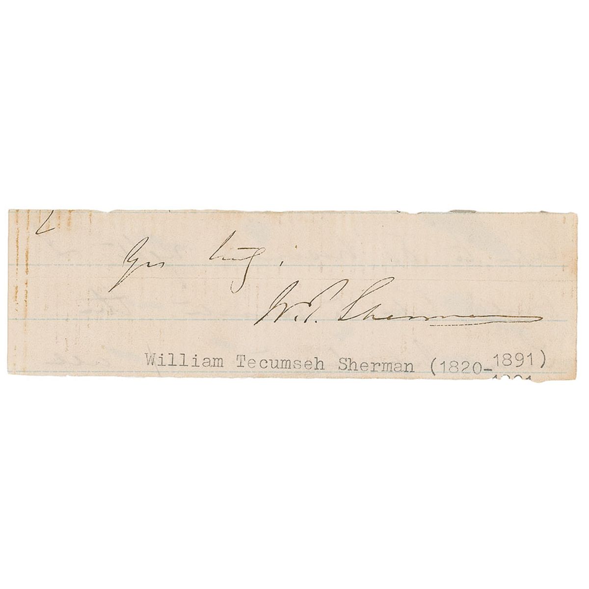 Ink signature, “Yrs truly, W. T. Sherman,” on an off-white 5 x 1.5 slip, clipped from the closing of a letter, with typed notations along bottom edge. In very good condition, with central vertical fold through second initial, scattered toning and soiling, and a horizontal fold directly above signature.