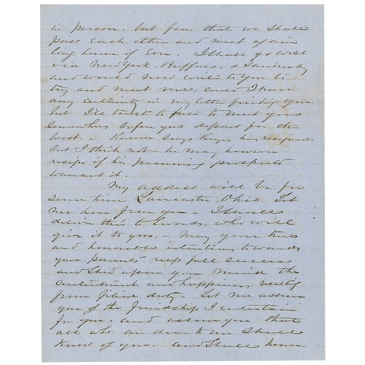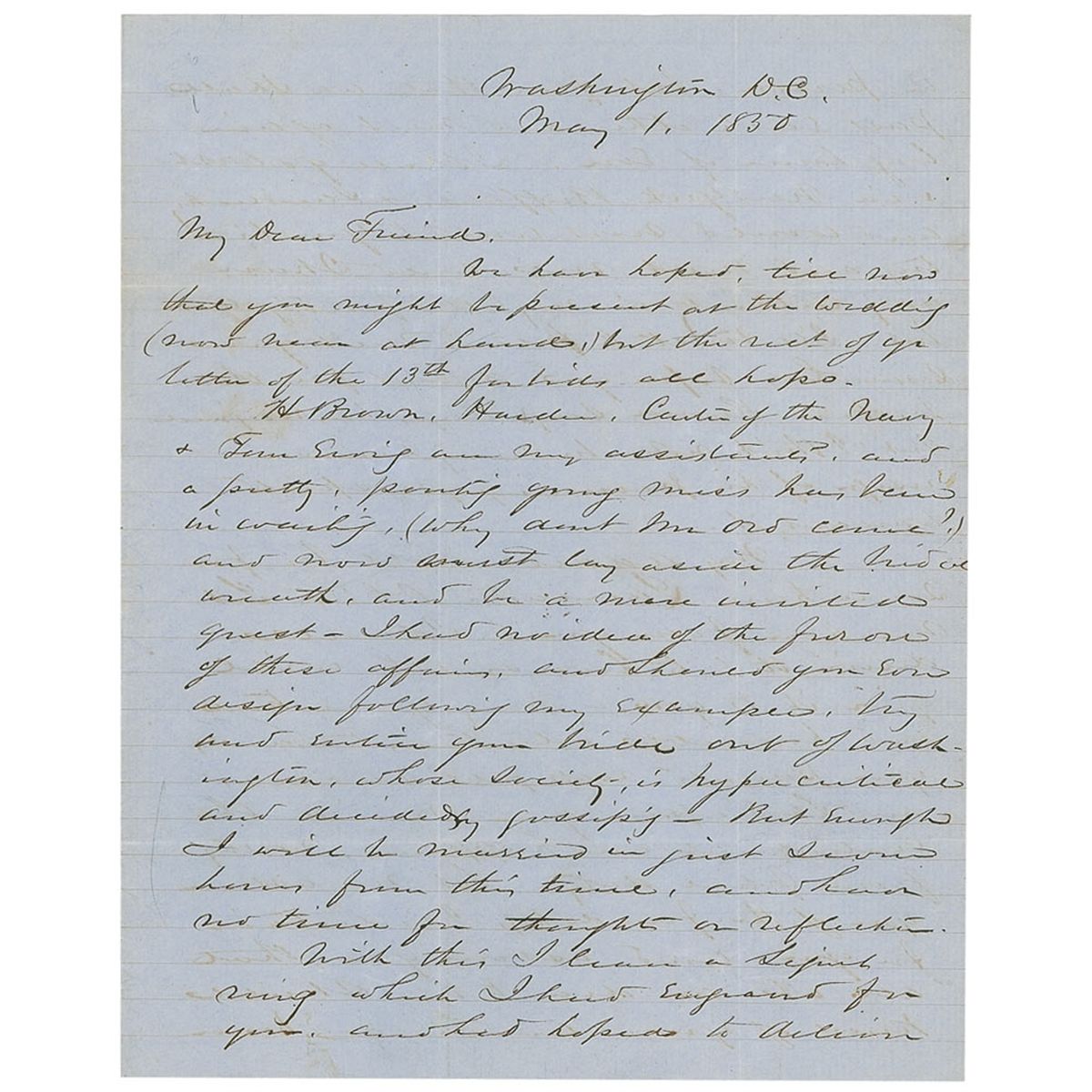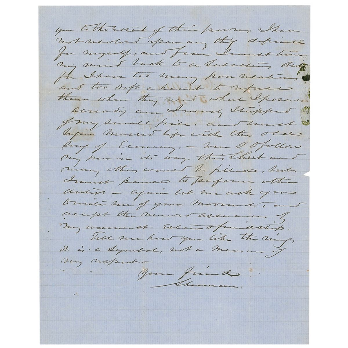 ALS signed “Sherman,” three pages, lightly-lined on two adjoining sheets, 8 x 9.75, May 1, 1850. Letter to Lieutenant E. C. Ord. In part: “We have hoped till now that you might be present at the wedding (now near at hand) but the rect of yr letter of the 13th forbids all hope. H Brown, Harder, Carter of the Navy & Tom Ewing are my assistants, and a pretty, perky young miss has been in waiting…I will be married in just seven hours from this time, and had no time for thought or reflection…With this I leave a Segint ring [not present] which I had engraved for you and had hoped to achieve in person, but from that we shall pass each other and meet again long hence if ever. I shall go west via New York, Buffalo, & Sandusky and would now write to you to try and meet me, could I have any certainty in my letter finding you, but I’ll trust to fate to meet you somewhere before you depart for the west…Let me assure you of the friendship I entertain for you and assure you that all who are dear to me shall know of you and shall honor you to the extent of their power. I have not resolved upon any thing definite for myself…I have too many poor relations and too soft a heart to refuse them when they need what I possess already am I nearly stripped of my small pile, and must begin married life with the old song of Economy…again let me ask you to write me of your movements and accept the renewed assurances of my warmest esteem & friendship. Tell me how you like the ring, it is a symbol, not a measure of my respect…” Reverse of second integral page is addressed by Sherman to Ord, “3rd Artillery, Washington, D. C.” Letter is housed in a custom-made green cloth covered four-flap folder. In very good to fine condition, with intersecting mailing folds, a few separations along folds, some light soiling, scattered toning, and light show-through from writing on opposite sides, otherwise fine condition. Born in Ohio 1820 in Lancaster, Ohio, Sherman’s father died when he was nine-years-old. Now widowed and unable to care for the entire family, his mother sent William to be raised by his father’s friend, Thomas Ewing. William Tecumseh Sherman and Ellen Ewing, Ewing’s daughter, were married from May 1, 1850, until Mrs. Sherman’s death on November 28,1888, at their home in New York City. At the time of their marriage, Thomas Ewing was serving as the first secretary of the interior, having been appointed to the newly created cabinet post by President Zachary Taylor on March 8, 1849.