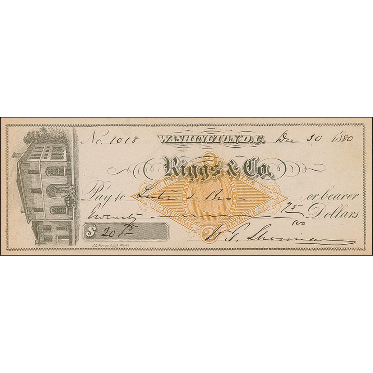 Superb Riggs & Co. business check, 7.5 x 3, filled out and signed by Sherman, “W. T. Sherman,” payable to Lutz & Bro. for $20.75, December 30, 1880. In fine condition, with light toning and two cancellation cuts to body.