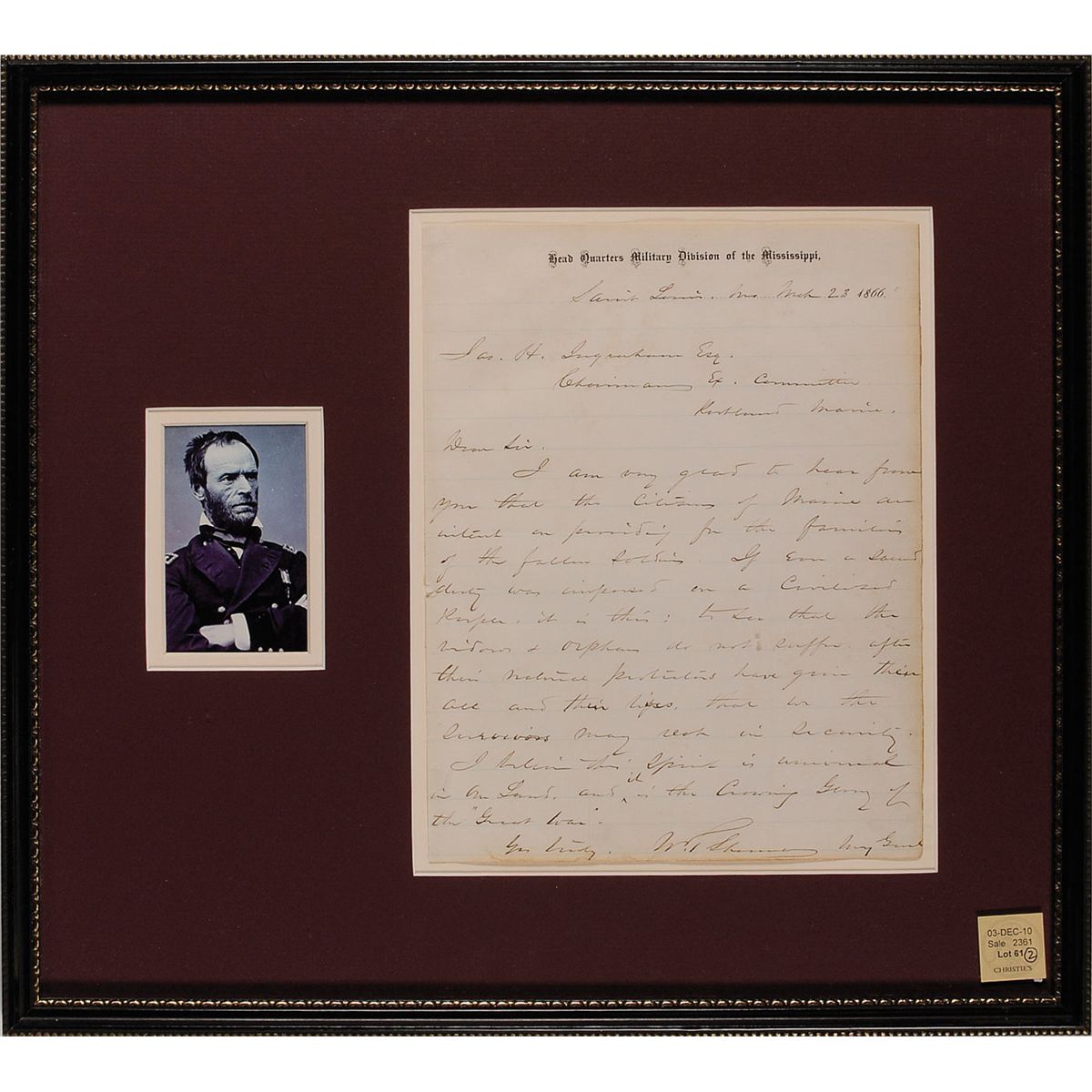 ALS signed “W. T. Sherman, Maj. Genl,” one page, lightly-lined, 7.5 x 9.5, Head Quarters Military Division of the Mississippi letterhead, March 23, 1866. Letter to James H. Ingraham of Portland, Maine. In full: “I am very glad to hear from you that the citizens of Maine are intent on providing for the families of the fallen soldiers. If ever a sacred duty was imposed on a Civilised People, it is this; to see that the widows and orphans do not suffer, after their natural protectors have given their all and their lives, that we the survivors may rest in security. I believe this spirit is universal in our Land, and it is the Crowning Glory of the ‘Great War.’” Matted and framed with a small portrait of Sherman to an overall size of 16.5 x 15. In very good condition, with intersecting folds, one through a single letter of signature, and scattered toning and soiling. Provenance: The Victor and Irene Murr Jacobs Collection, Sotheby’s, October 29, 1996; Christies Sale 2361, December 3, 2010.